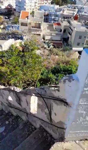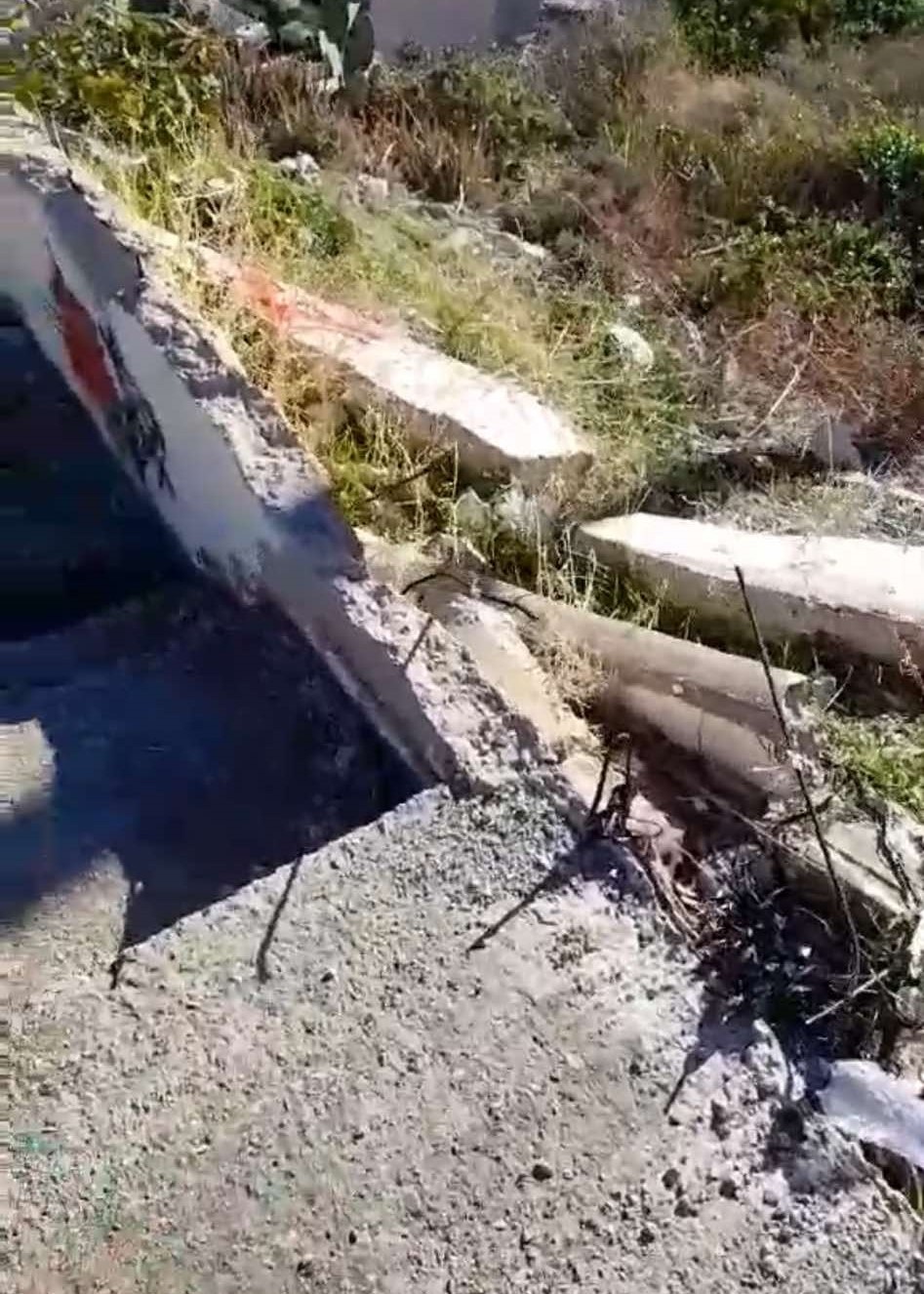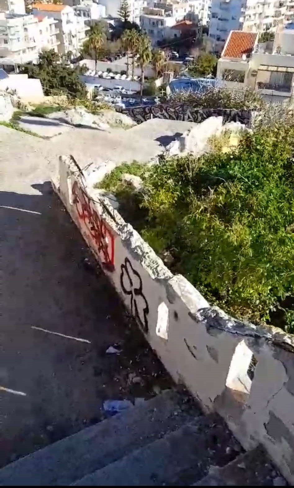 Τις φωτογραφίες από τη σημερινή κατάσταση της τσιμεντένιας σκάλας μας έστειλε κάτοικος της περιοχής αναφέροντας ότι τα παιδιά που φοιτούν κυρίως στο 16ο δημοτικόαλλά και στο 1ου Γυμνάσιο και ανεβαίνουν από εκεί, πραγματικά κινδυνεύουν τόσο από τα σκουριασμένα σίδερα που εξέχουν από το τοιχίο, όσο και από τα σημεία που το τοιχίο έχει κατακρημνιστεί σε παρακείμενα οικόπεδα.