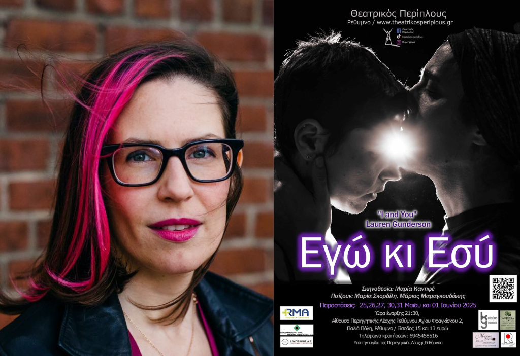 Μία από τις κορυφαίες σύγχρονες Αμερικανίδες συγγραφείς, η Lauren Gunderson, από το Λονδίνο όπου βρίσκεται για την πρεμιέρα ενός νέου της έργου, στέλνει τις θερμότερες ευχές της στην ομάδα του Θεατρικού Περίπλου, λίγο πριν από την πρεμιέρα του «Εγώ κι Εσύ» στην Κρήτη.