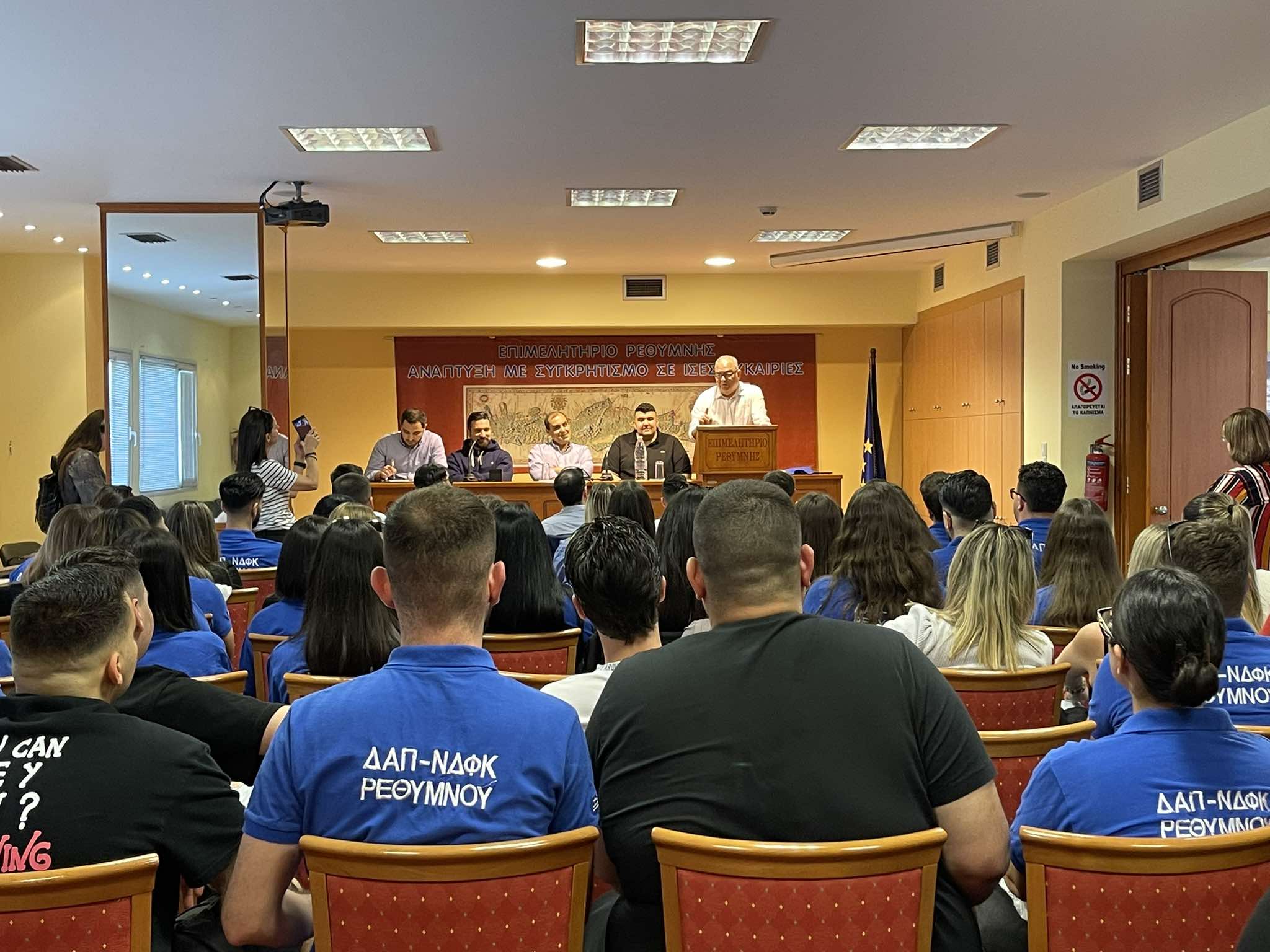 Ο Βαγγέλης Ασβεστόπουλος Πρόεδρος Δ.Α.Π ΝΔΦΚ Ρεθύμνου υπογράμμισε: «Διοργανώνουμε αυτήν την πολύ όμορφη εκδήλωση που είναι η τελευταία εκδήλωση πριν τις αυριανές φοιτητικές εκλογές. Θα μιλήσουμε γενικά για το φοιτητικό κίνημα σε όλη τη χώρα που θεωρούμε κι εμείς ως ΔΑΠ ΝΔΦΚ Ρεθύμνου, αλλά και στα όργανα στα οποία συμμετέχουμε στο Πανεπιστήμιο στους φοιτητικούς συλλόγους ότι είναι πολύ σημαντικό να είναι ενεργό και να λαμβάνει μέρος σε όλες τις δημοκρατικές διαδικασίες που λαμβάνουν χώρα στο πανεπιστήμιο, καθώς με αυτό τον τρόπο διεκδικούμε αυτά που πρέπει να έχει κάθε φοιτητής στο ελληνικό δημόσιο πανεπιστήμιο, το οποίο κρατάει ψηλά τη σημαία και ιδιαίτερα στο Πανεπιστήμιο Κρήτης. Είναι μεγάλη μας χαρά σήμερα που έχουμε τον υφυπουργό εδώ».