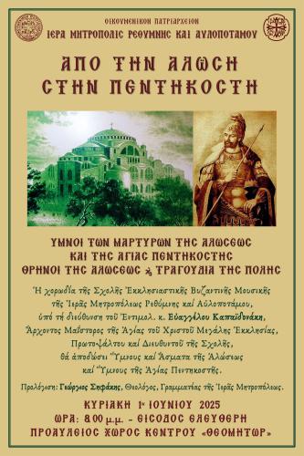 Η χορωδία της Σχολής Εκκλησιαστικής Βυζαντινής Μουσικής της Ιεράς Μητροπόλεως Ρεθύμνης και Αυλοποτάμου, υπό τη διεύθυνση του Εντιμολ. κ. Ευαγγέλου Καπαϊδονάκη, Άρχοντος Μαΐστορος της Αγίας του Χριστού Μεγάλης Εκκλησίας, Πρωτοψάλτου και Διευθυντού της Σχολής, θα αποδώσει Ύμνους και Άσματα της Αλώσεως και Ύμνους της Αγίας Πεντηκοστής.
