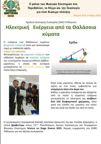 Το Σχολείο Δεύτερης Ευκαιρίας Ρεθύμνου συμμετείχε στη Γιορτή Φυσικών Επιστημών 2025 με τίτλο: «Ο ρόλος των Φυσικών Επιστημών στο Περιβάλλον, το Κλίμα και την Οικολογία για έναν βιώσιμο πλανήτη» που πραγματοποιήθηκε με επιτυχία στις 10 και 11 Μαΐου στο Σπίτι του Πολιτισμού. Το Σάββατο 10 Μαΐου το Σ.Δ.Ε. βραβεύτηκε για τη συμμετοχή του και την Κυριακή 11 Μαΐου συμμετείχε ενεργά με ομάδα εκπαιδευομένων του Α Κύκλου Σπουδών και με κατασκευή – πείραμα με τίτλο: “Ηλεκτρική Ενέργεια από τα θαλάσσια κύματα.”