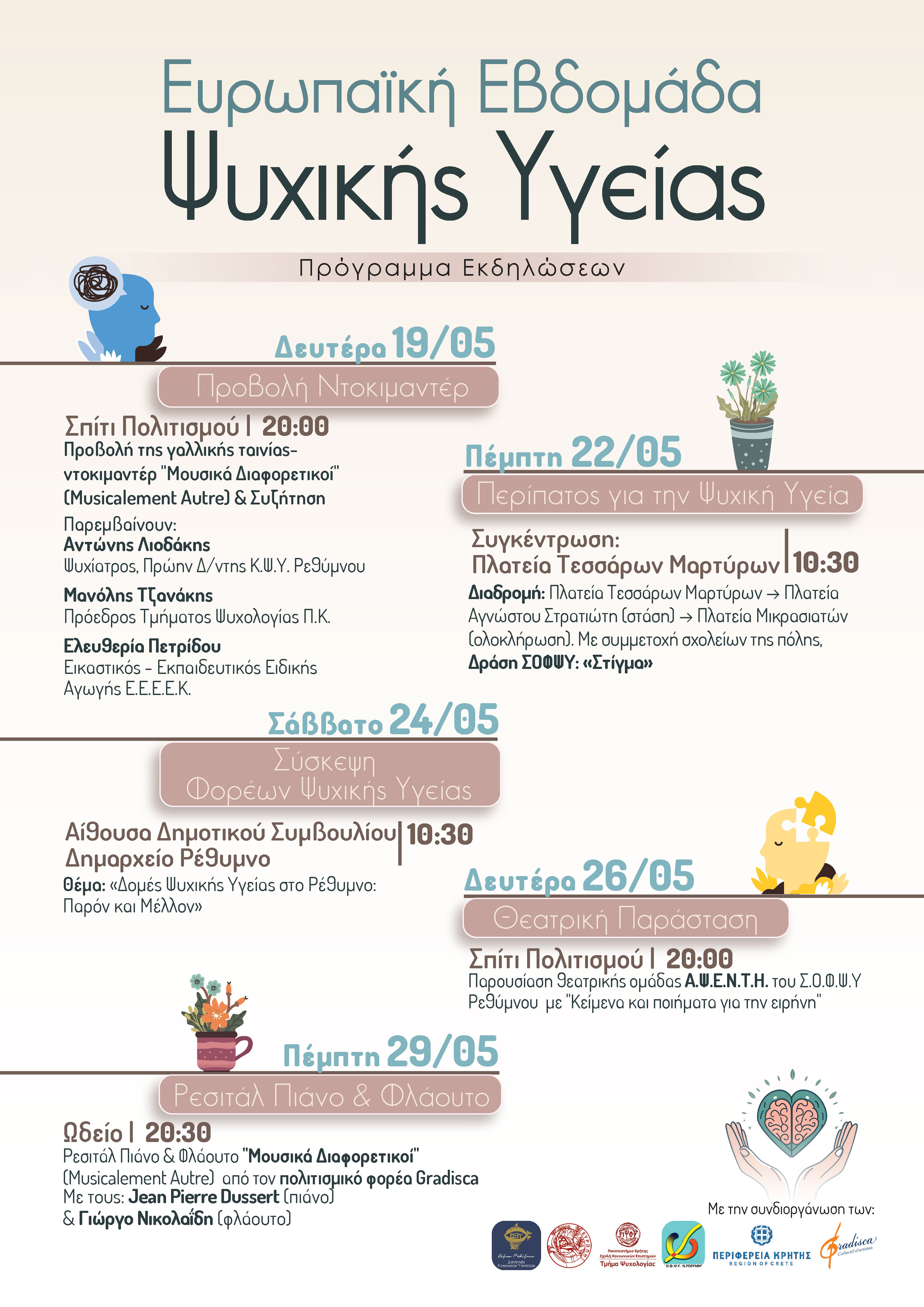 Ξεκινούν σήμερα, Δευτέρα 19 Μαΐου, οι εκδηλώσεις που συνδιοργανώνουν φορείς και θεσμοί του Ρεθύμνου στο πλαίσιο της Ευρωπαϊκής Εβδομάδας Ευαισθητοποίησης για την Ψυχική Υγεία 2025.