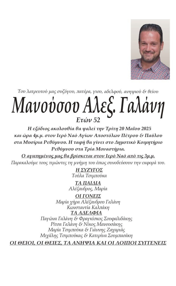 Ο Μανούσος Γαλάνης ήταν μέλος του συλλόγου παλαίμαχων ποδοσφαιριστών και όσοι τον ήξεραν μιλούν για έναν πράο και ήρεμο χαρακτήρα που άφηνε πάντα τις καλύτερες εντυπώσεις.