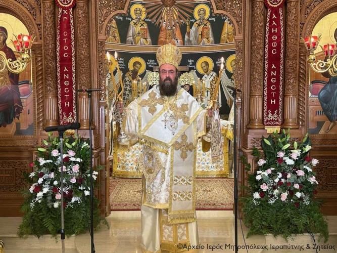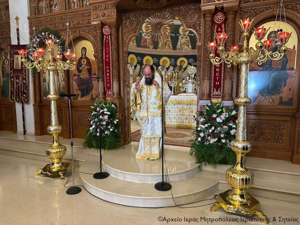 Με γλαφυρότητα και μεστό λόγο ο Σεβασμιώτατος αναφέρθηκε στις μεγάλες θεολογικές αλήθειες της Ευαγγελικής περικοπής της ημέρας από το κατά Ιωάννη Ευαγγέλιο (Ιω. 4, 5-42), όπου περιγράφεται η συνάντηση του Θεανθρώπου με τη Σαμαρείτιδα στη Συχάρ της Σαμάρειας. Αφού εξήγησε τους ιστορικούς λόγους της διαμάχης μεταξύ Ιουδαίων και Σαμαρειτών, που καθιστούσε παράδοξο γεγονός τον συγκεκριμένο διάλογο του Χριστού με τη Σαμαρείτισσα γυναίκα, εξήγησε ότι το «ύδωρ το ζων» είναι το Άγιο Πνεύμα που δροσίζει και ανακαινίζει τη ύπαρξή μας. Όπως υπογράμμισε, για να το λάβουμε τη Χάρη του Θεού και τη δρόσο του Αγίου Πνεύματος θα πρέπει πρώτα να καθαρίσουμε την δεξαμενή, τη στέρνα της ψυχής και της καρδιάς μας με τη μετάνοια. Ο Σεβασμιώτατος επεσήμανε ακόμα ότι ο Χριστός με τον αποκαλυπτικό διάλογο για την προσωπική της ζωή αλλά και για την «εν πνεύματι και αληθεία» προσκύνηση του Θεού βοήθησε τη μέχρι τότε αμαρτωλή γυναίκα και μετέπειτα Αγία Φωτεινή να μετανοήσει, γι’ αυτό αφήνει τη στάμνα της και σπεύδει να ανακοινώσει στην πόλη ότι γνώρισε τον Μεσσία. Ανακαινίζεται, βαπτίζεται, κηρύττει τον αληθινό Θεό και θα μαρτυρήσει για τον Χριστό μαζί με τις τέσσερις αδελφές της, Φωφώ, Φωτίδα, Παρασκευή και τους δύο γιούς της, Βίκτωρα και Ιωσή.