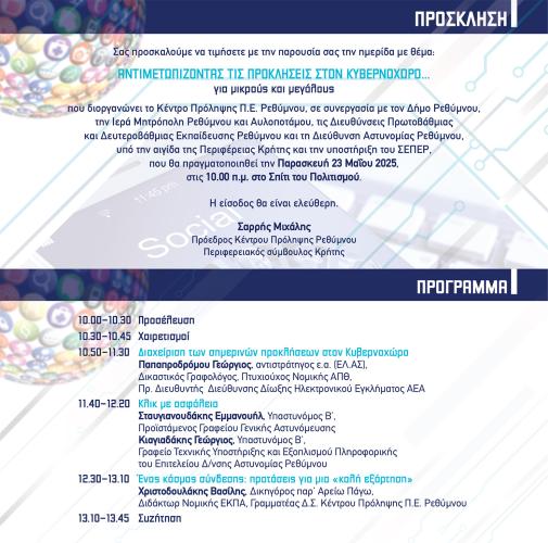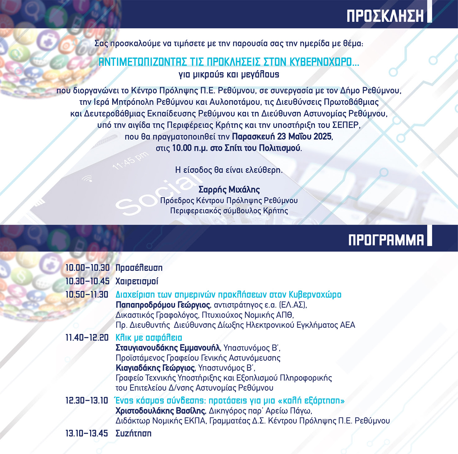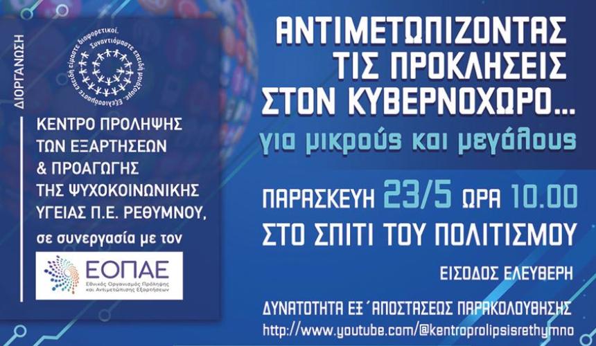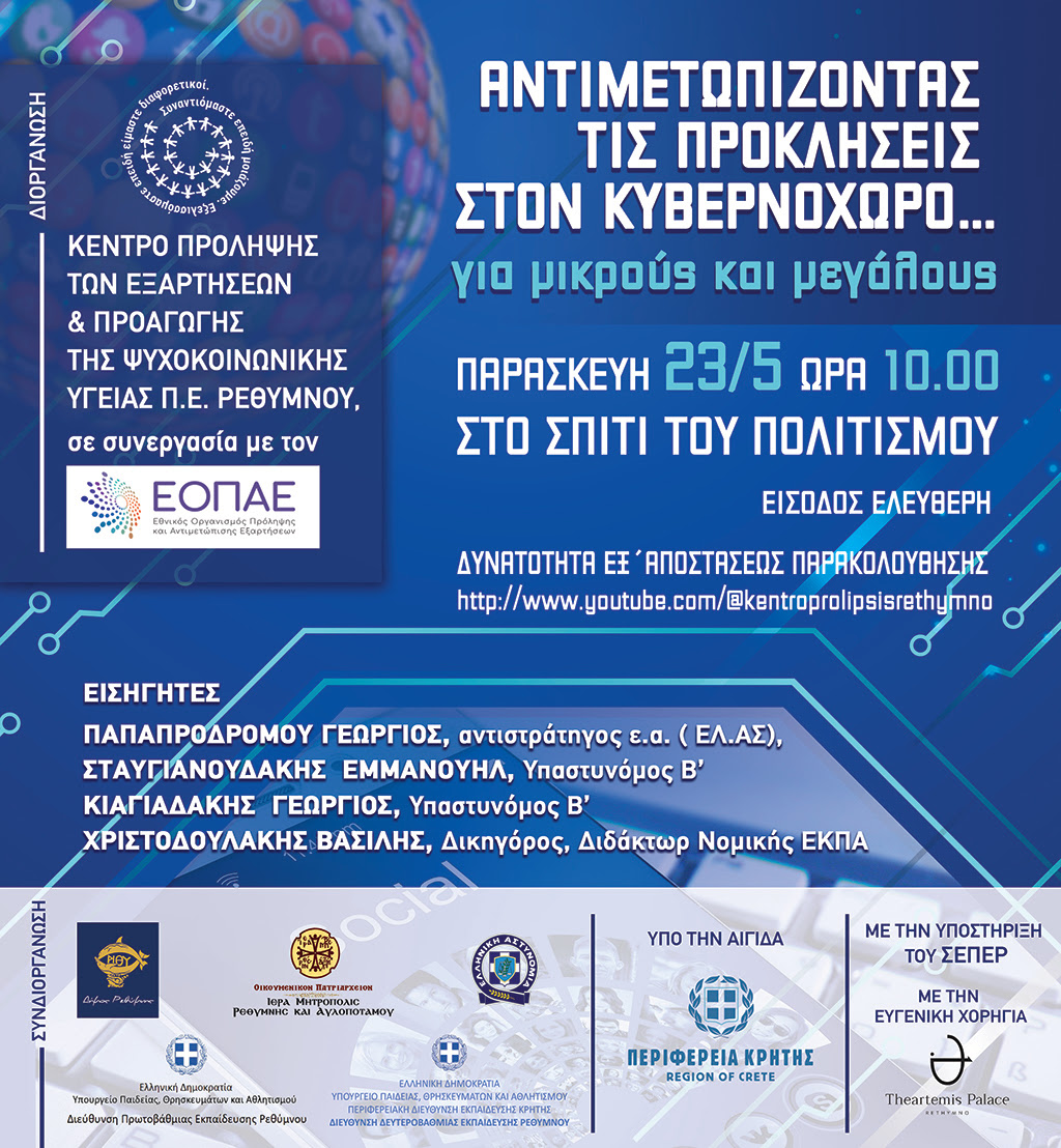 Το Κέντρο Πρόληψης των Εξαρτήσεων και Προαγωγή της Ψυχοκοινωνικής Υγείας Π.Ε. Ρεθύμνου, σε συνεργασία με τον Εθνικό Οργανισμό Πρόληψης και Αντιμετώπισης Εξαρτήσεων Ε.Ο.Π.Α.Ε., διοργανώνει ημερίδα ενημέρωσης – ευαισθητοποίησης για μαθητές Πρωτοβάθμιας και Δευτεροβάθμιας Εκπαίδευσης, εκπαιδευτικούς και γονείς, με θέμα «Αντιμετωπίζοντας τις προκλήσεις στον κυβερνοχώρο… για μικρούς και μεγάλους » , σε συνδιοργάνωση με τον Δήμο Ρεθύμνου, την Ιερά Μητρόπολη Ρεθύμνου και Αυλοποτάμου, τις Διευθύνσεις Πρωτοβάθμιας και Δευτεροβάθμιας Εκπαίδευσης Ρεθύμνου, τη Διεύθυνση Αστυνομίας Ρεθύμνου, με την υποστήριξη του ΣΕΠΕΡ και τελεί υπό την αιγίδα της Περιφέρειας Κρήτης.