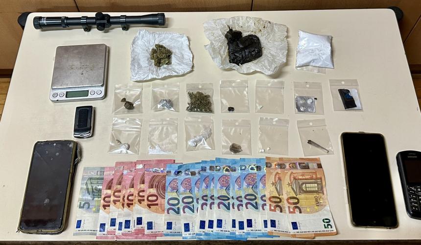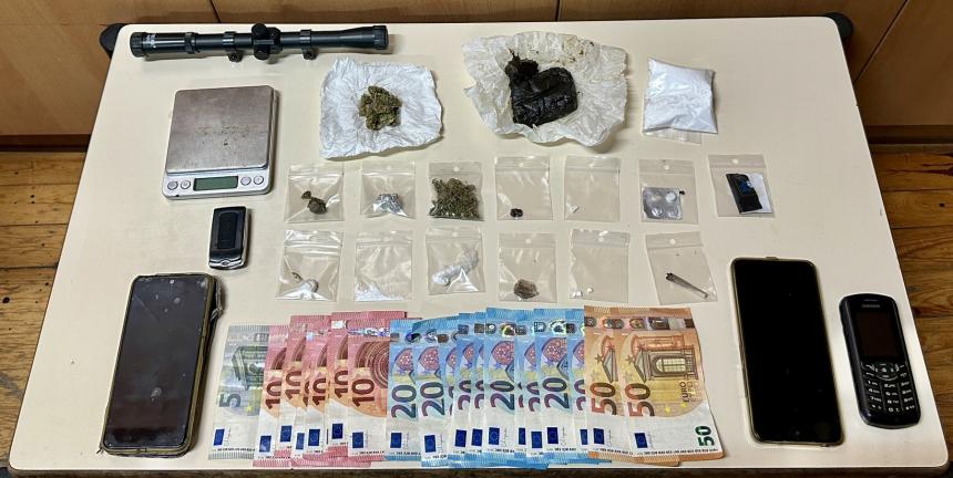 Κατασχέθηκαν μεταξύ άλλων 76,2 γραμμάρια κατεργασμένης κάνναβης «σοκολάτα», μικροποσότητα κοκαΐνης και ηρωίνης, 2 ζυγαριές ακριβείας και χρηματικό ποσό