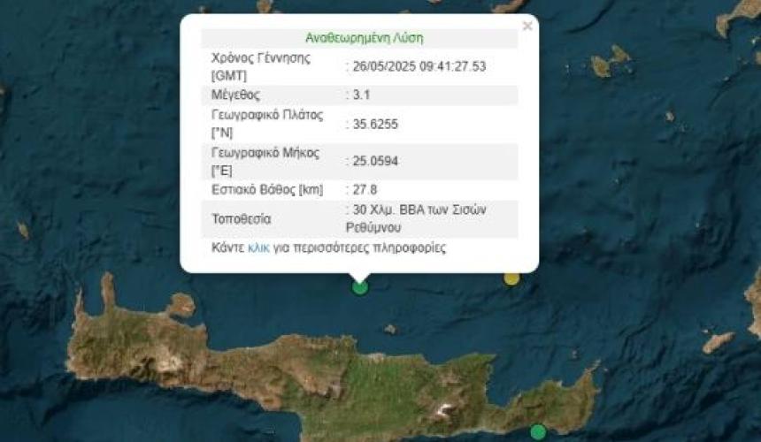 ΡΕΘΥΜΝΟ 26.05.2025 12:59Ασθενής σεισμός βόρεια του Ρεθύμνου Ρέθεμνος Newsroom Facebook Twitter Copy link 0 Νέος σεισμός της τάξεως των 3,1 Ρίχτερ σημειώθηκε στις 12:41 στα βόρεια της Κρήτης.Συγκεκριμένα, είχε επίκεντρο 30 χλμ. ΒΒΑ των Σισών Ρεθύμνου και εστιακό βάθος τα 27,8 χλμ. 0 Facebook Twitter Copy link ΣΧΕΤΙΚΑ ΑΡΘΡΑ Ρέθυμνο 14.12.2025 19:48Εργάτες, αγρότες και όλος ο λαός ενάντια στον προϋπολογισμό της φτώχειας και του πολέμου Ρέθυμνο 14.12.2025 19:47Κάλεσμα του Νομαρχιακού Τμήματος ΑΔΕΔΥ Ρεθύμνου για την Απεργία 16/12 Ρέθυμνο 14.12.2025 11:28Ρέθυμνο: Τσουχτερό πρόστιμο σε άνδρα που θέλησε να κάψει υπολείμματα καλλιέργειας Ρέθυμνο 13.12.2025 15:48Επανεκλογή Γιάννη Μαρινάτου στο Γενικό Συμβούλιο της ΑΔΕΔΥ