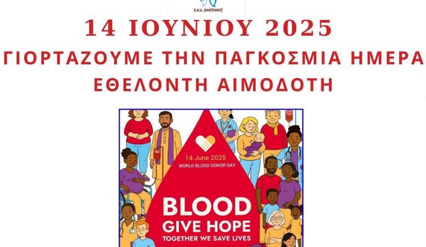 Ο Σύλλογος Εθελοντών Αιμοδοτών Ν. Ρεθύμνου «ΔΟΤΕΣ ΖΩΗΣ» σας προσκαλεί να γιορτάσουμε μαζί την Παγκόσμια Ημέρα Εθελοντή Αιμοδότη, όχι με λόγια, αλλά με πράξεις αγάπης και ζωής.