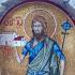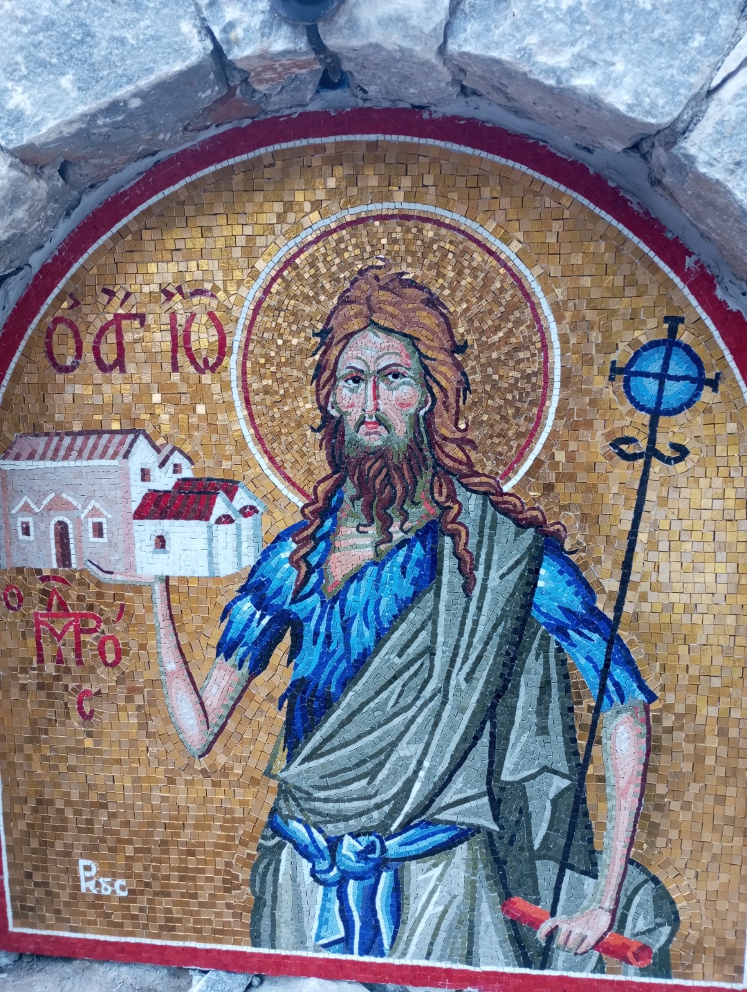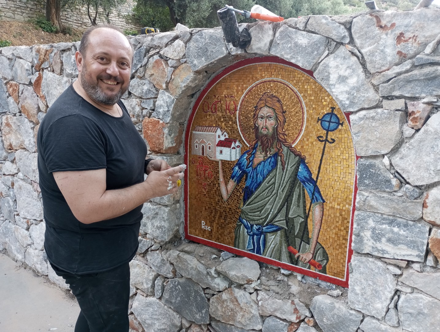 Ο Αγιογράφος Εμμανουήλ Ρουκούδης καθώς τοποθετεί ένα νέο θαυμάσιο ψηφιδωτό στην είσοδο της Μονής.
