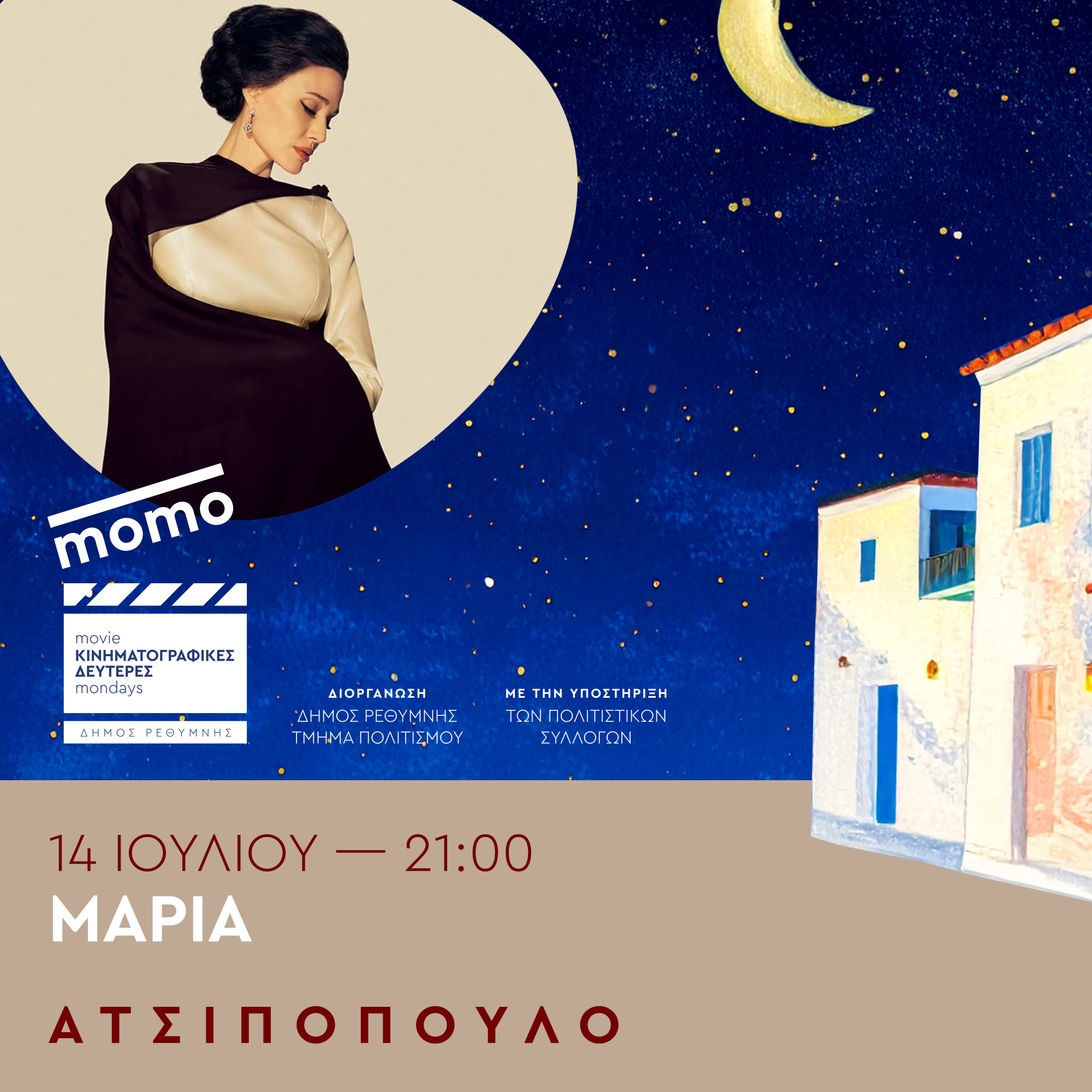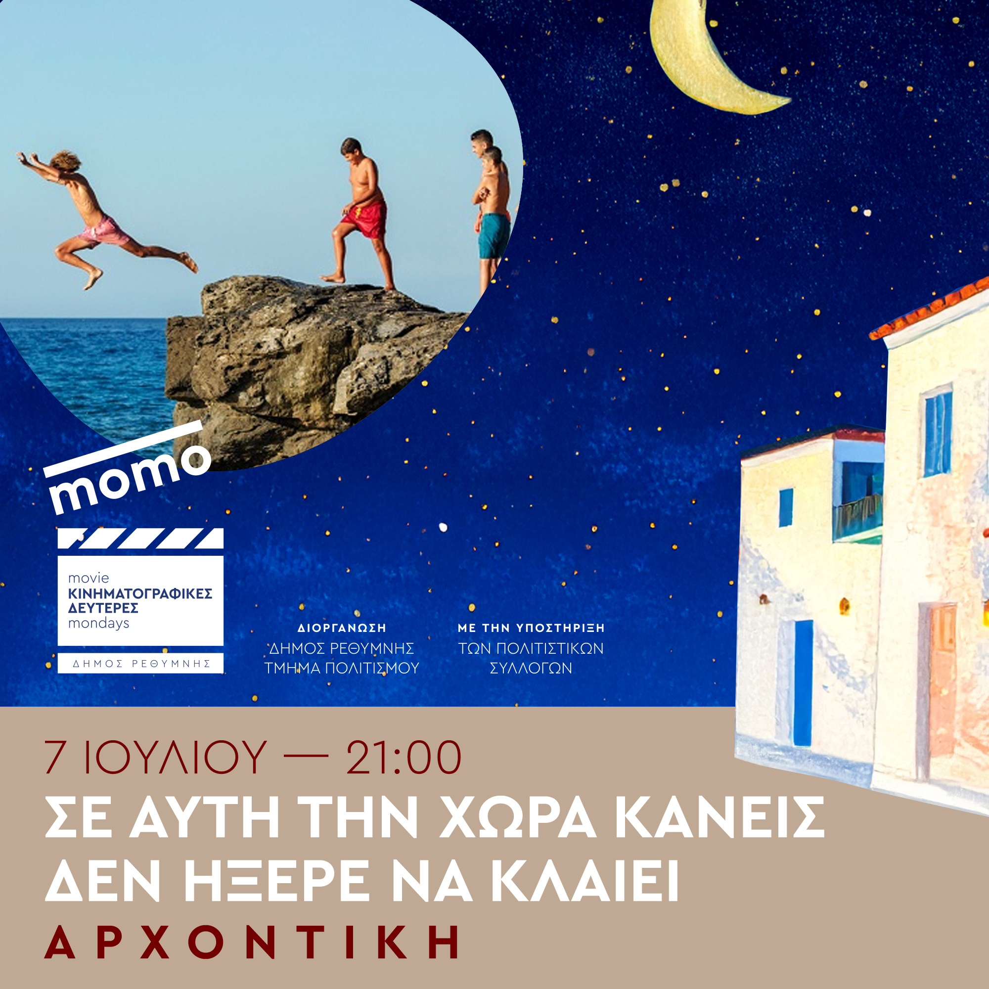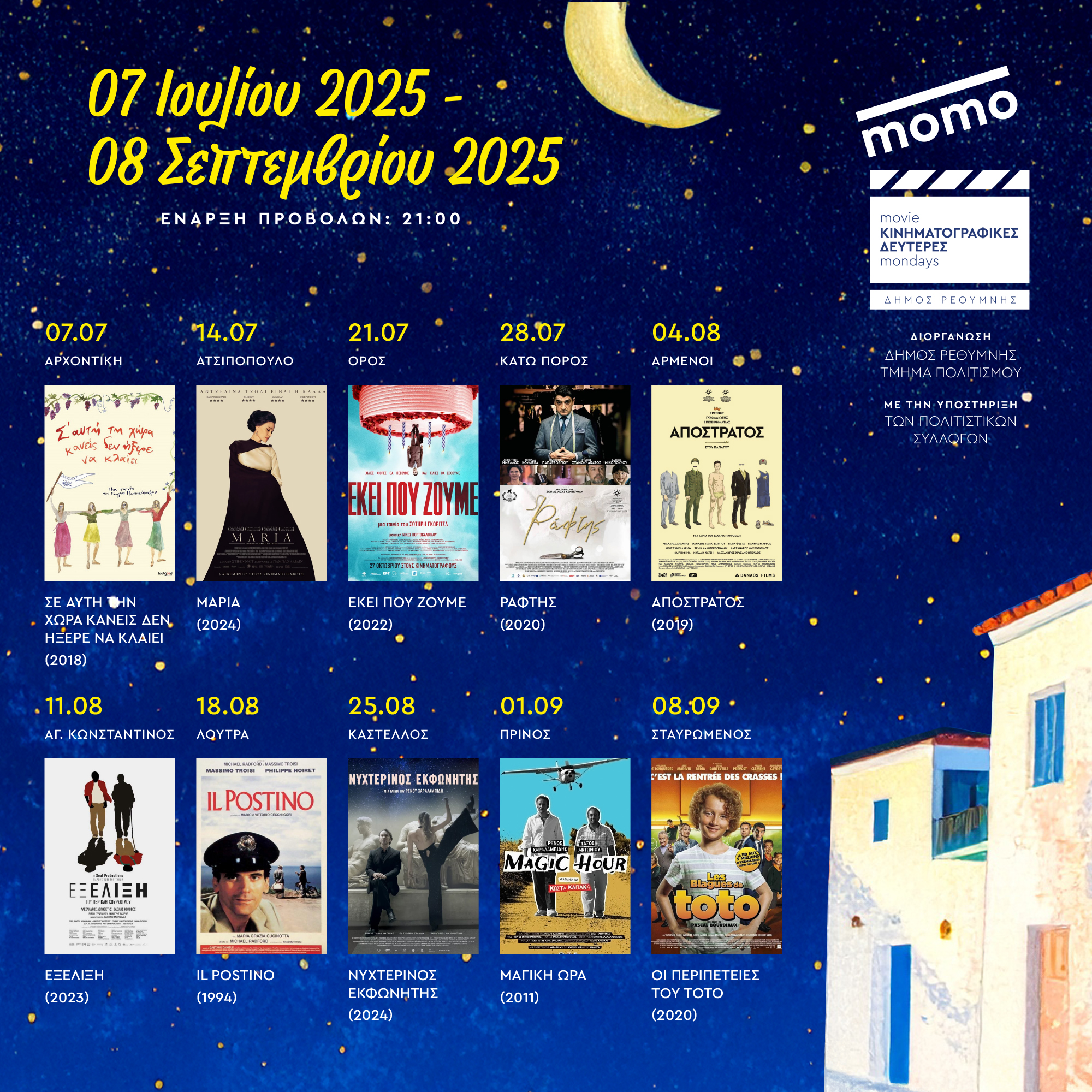 Με αφορμή την έναρξη του προγράμματος «Κινηματογραφικές Δευτέρες», ο Αντιδήμαρχος Πολιτισμού κ. Μάνος Τσάκωνας απευθύνει πρόσκληση συμμετοχής σε όλο τον κόσμο, καλώντας τους λάτρεις της 7ης Τέχνης να απολαύσουν το μοναδικό κλίμα που δημιουργείται στα όμορφα χωριά μας. Καλεί το κοινό του Ρεθύμνου να απολαύσει αυτές τις μοναδικές βραδιές στα χωριά του Δήμου Ρεθύμνης και απευθύνει ειλικρινείς ευχαριστίες προς τους πολιτιστικούς συλλόγους των οικισμών για την συνεργασία και την δυναμική συμβολή τους στην διοργάνωση των εκδηλώσεων Το πρόγραμμα των κινηματογραφικών προβολών έχει ως ακολούθως: