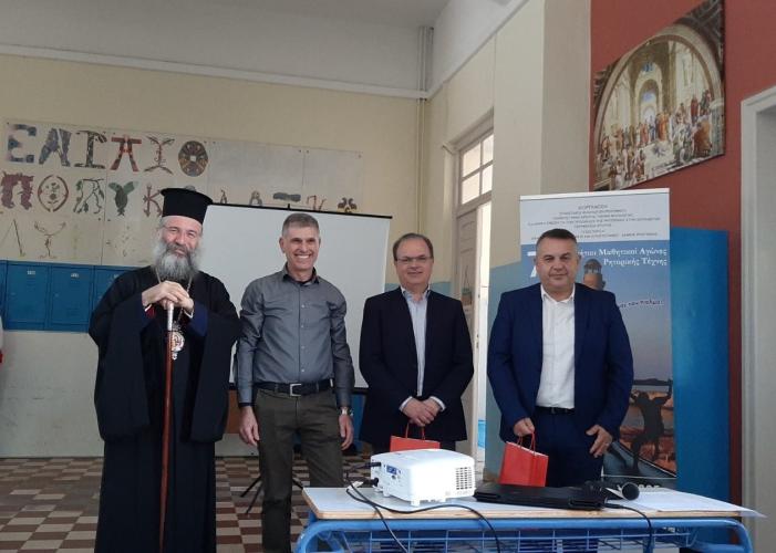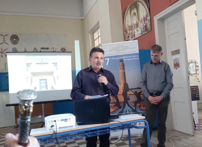 Ακολούθησε χαιρετισμός του κ. Κωστή Αποστολάκη εκ μέρους του Τμήματος Φιλολογίας. Ο καθηγητής αναφέρθηκε στη σπουδή της ρητορικής τέχνης η οποία μπορεί να μας θωρακίσει απέναντι στην απατηλή γοητεία του ρητορικού λόγου και να μας εφοδιάσει με την τεκμηριωμένη δυσπιστία που αποτελεί τη βάση για την ανάπτυξη της κριτικής σκέψης. Προέτρεψε, επίσης, τους μαθητές να είναι νηφάλιοι και δύσπιστοι, γιατί αυτό είναι το θεμέλιο της σύνεσης, να βάζουν όρια στη χρήση της ρητορικής και να την εναρμονίζουν με τις αξίες του ανθρώπου.