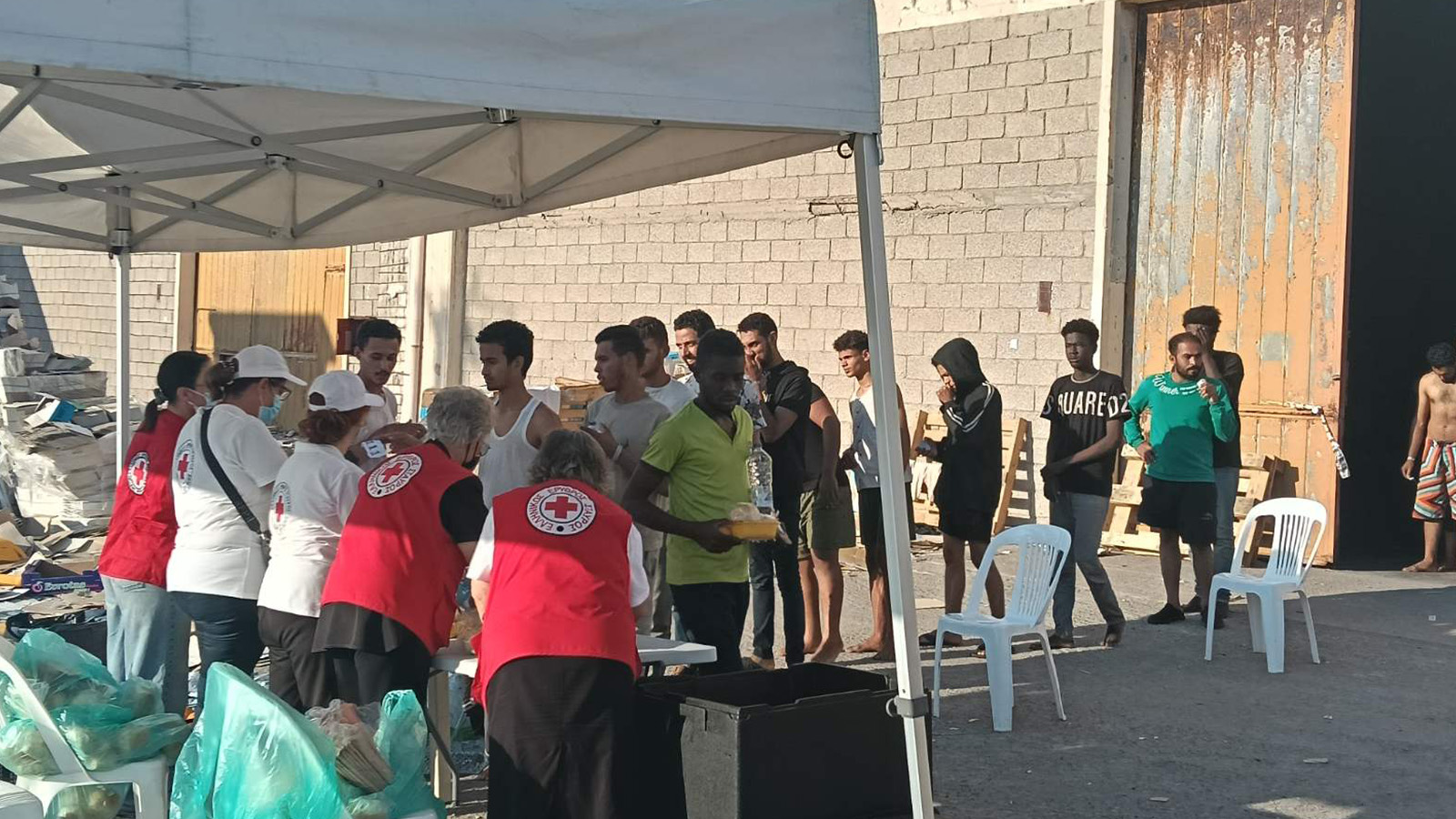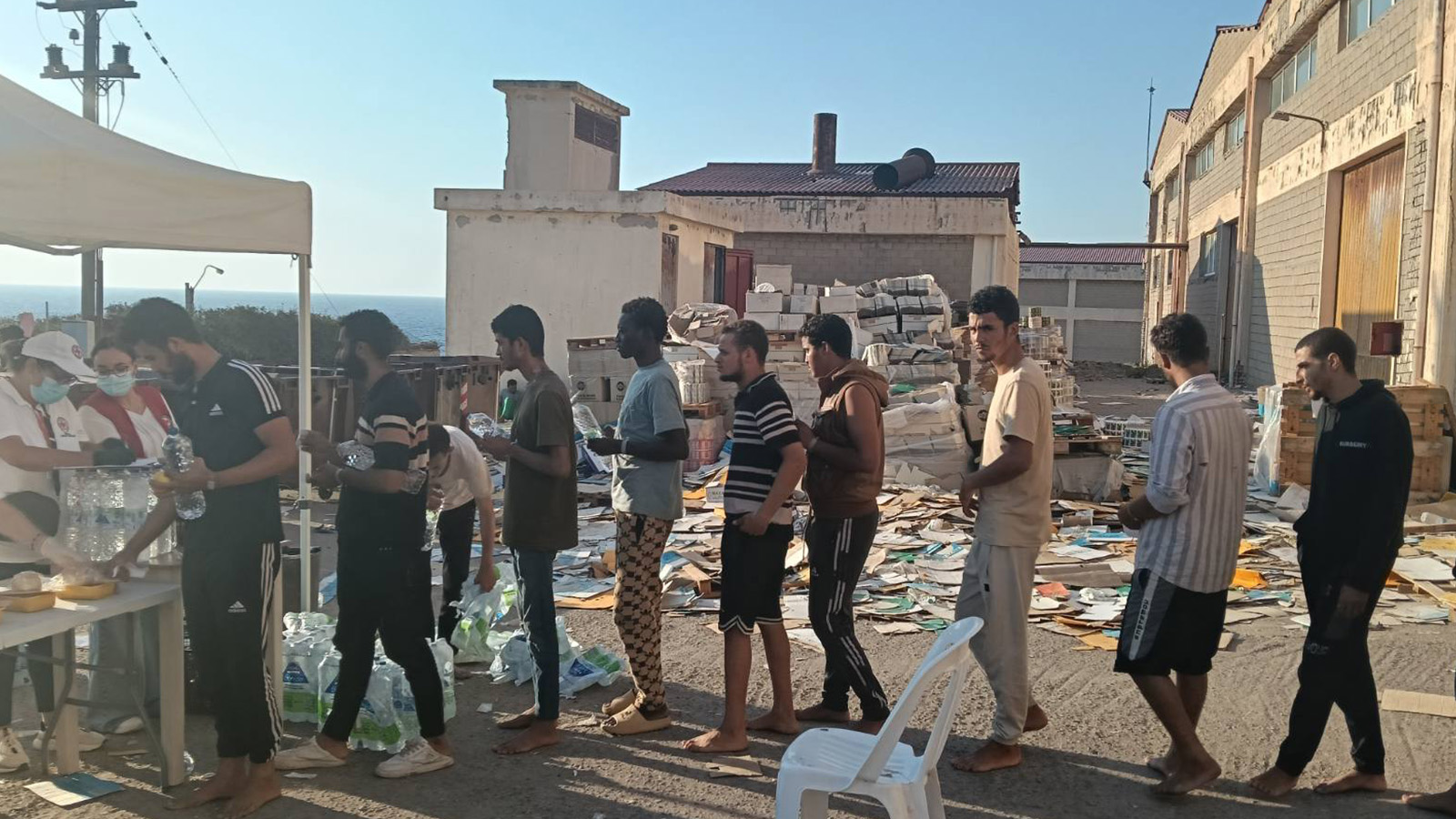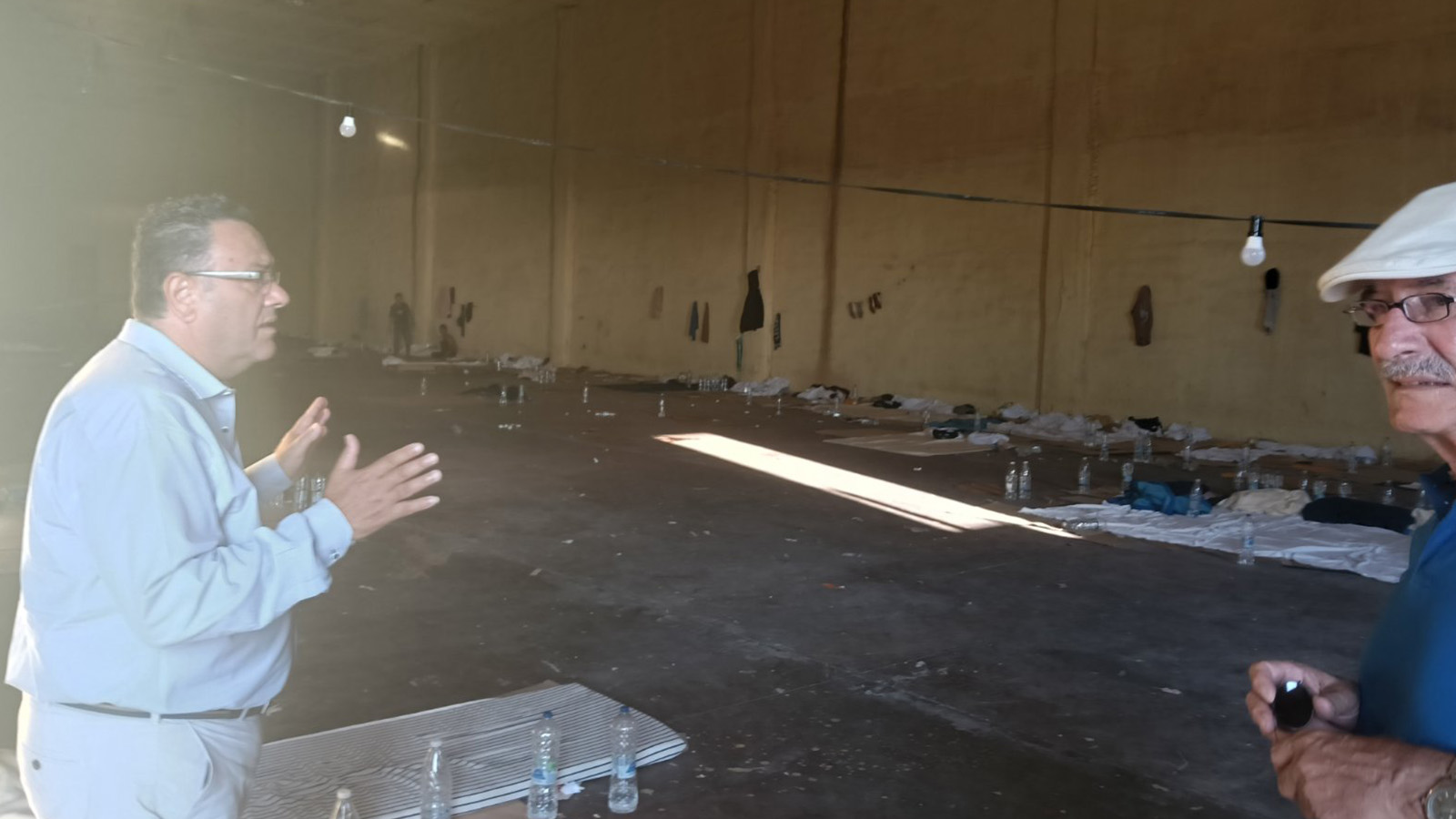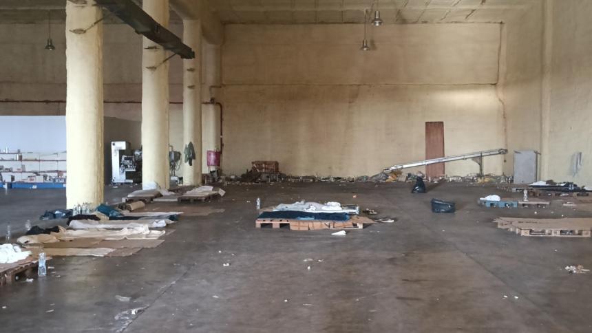 Η εικόνα που αντικρίσαμε δείχνει τις απάνθρωπες συνθήκες που επικρατούν: Κυριολεκτικά οι ξεριζωμένοι είναι πεταμένοι σε έναν χώρο που δεν τους εξασφαλίζει καμία υγειονομική προστασία. Πρόκειται για μια εγκαταλελειμμένη αποθήκη χωρίς κανέναν εξαερισμό και υποδομή για την ανθρώπινη φιλοξενία αυτών των ανθρώπων. Δεν υπάρχουν χώροι υγιεινής, χώρος για να φάνε και οι περισσότεροι κοιμούνται στο πάτωμα, σε χάρτινες κούτες!