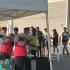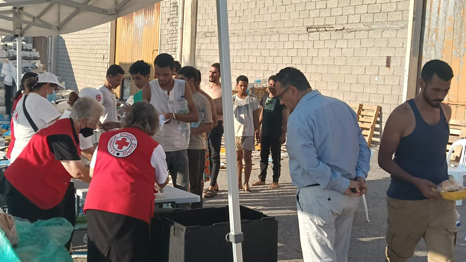 Το κλιμάκιο του ΚΚΕ έφτασε την ώρα που μοιραζόταν φαγητό από κλιμάκιο του Ερυθρού Σταυρού. Καρτερικά περίμεναν οι ξεριζωμένοι να πάρουν την μερίδα φαγητού και να βρουν μια καθαρή γωνία για να φάνε, αφού ο προαύλιος χώρος είναι γεμάτος μπάζα και σκουπίδια.