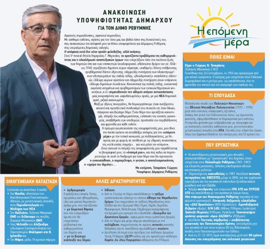 ΑΝΑΚΟΙΝΩΣΗ ΥΠΟΨΗΦΙΟΤΗΤΑΣ ΔΗΜΑΡΧΟΥ ΓΙΑ ΤΟΝ ΔΗΜΟ ΡΕΘΥΜΝΗΣ