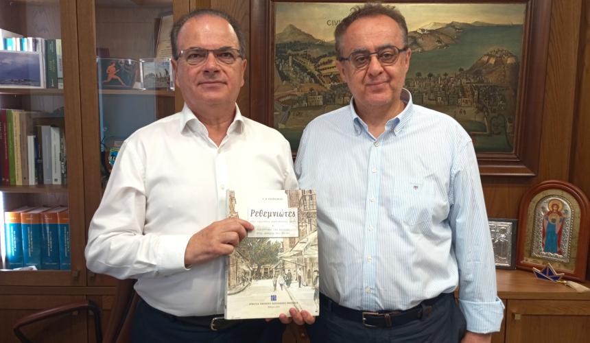 Δήμαρχος Ρεθύμνης κ. Γιώργης Χ. Μαρινάκης υποδέχθηκε σήμερα στο γραφείο του, τον Πρόεδρο της Δημόσιας Κεντρικής Βιβλιοθήκης Ρεθύμνου, Καθηγητή Κωνσταντίνο Σπανουδάκη, ο οποίος του δώρισε την νέα έκδοση του πνευματικού ιδρύματος.