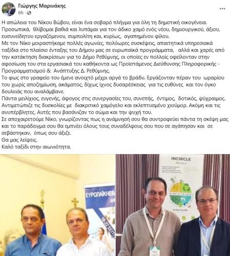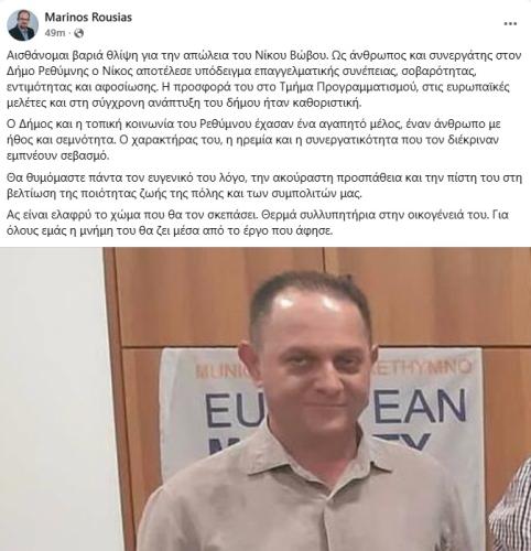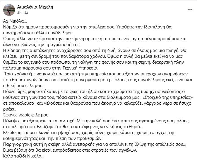 Απαρηγόρητη είναι η Δημοτική Οικογένεια για τον αγαπημένο της συνάδελφο, καθώς τις τελευταίες ώρες οι αναρτήσεις πένθους στα μέσα κοινωνικής δικτύωσης ακολουθούν η μία την άλλη.