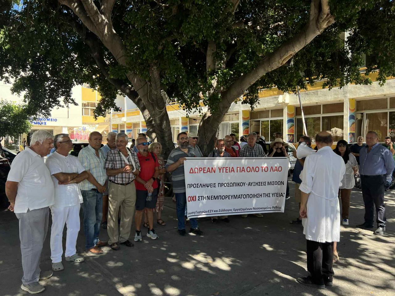 Απευθυνόμαστε και στον υπουργό και βουλευτή του Ρεθύμνου, τον κύριο Κεφαλογιάννη, και στον βουλευτή του Ρεθύμνου, τον κύριο Χνάρη, καθώς και στους αντιπεριφερειάρχες και στους δημάρχους του νομού του Ρεθύμνου, και ζητούμε την στήριξη στον αγώνα μας για το νοσοκομείο του Ρεθύμνου.»