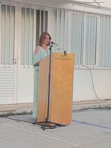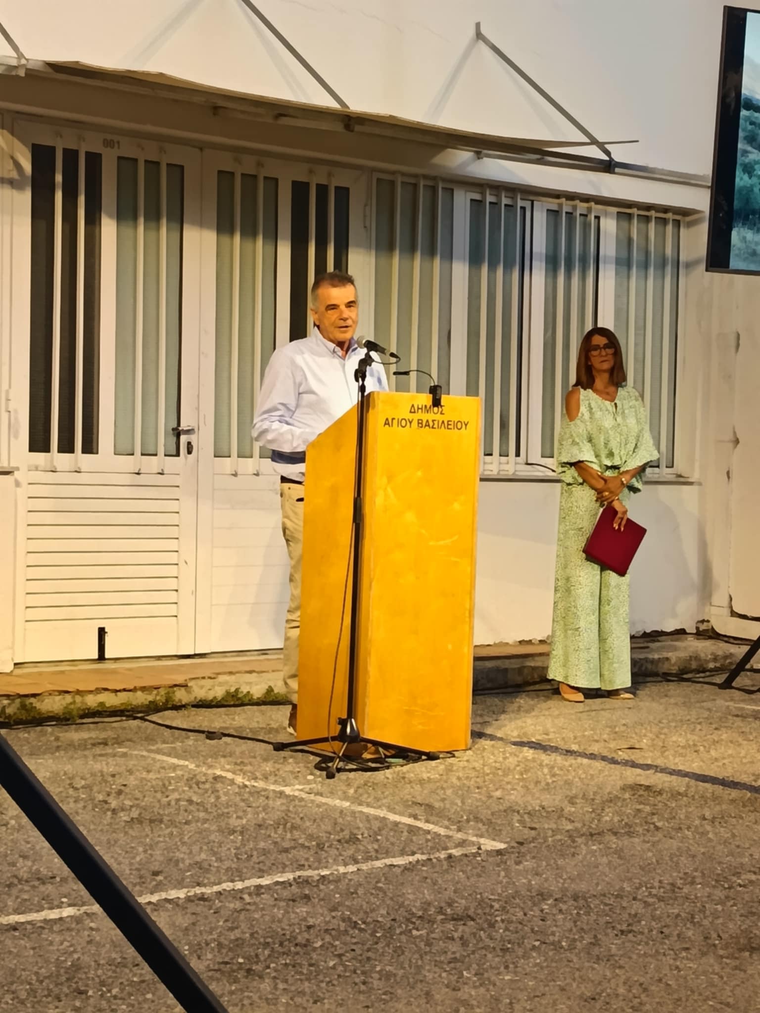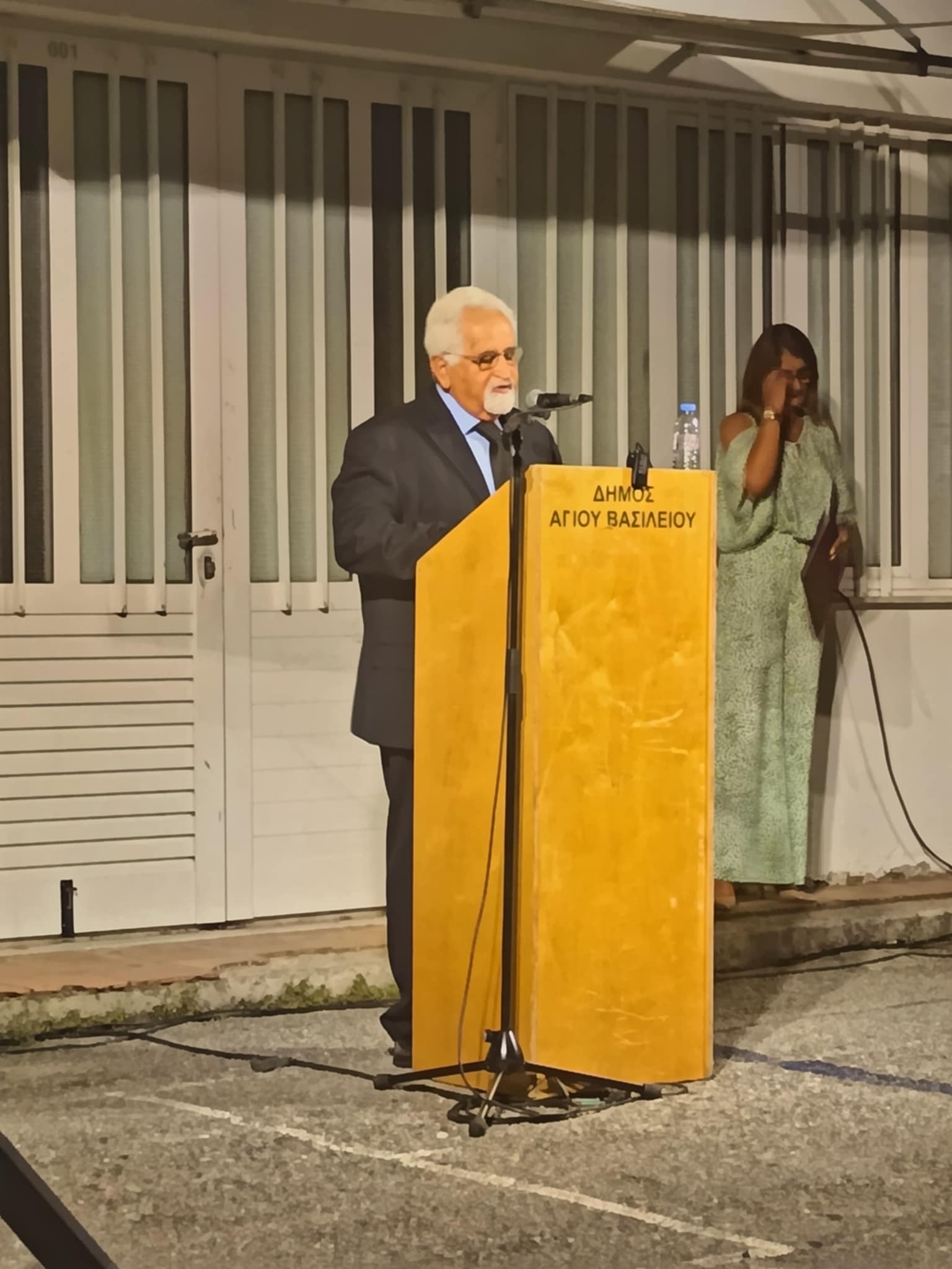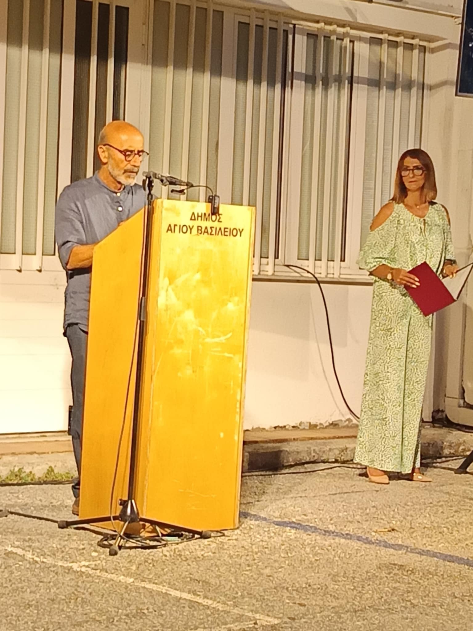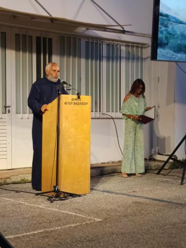 Στον χαιρετισμό της , η Αντιδήμαρχος Πολιτισμού του Δήμου Αγίου Βασιλείου κ. Ευαγγελία Γλαμπεδακη η οποία συντόνισε και την εκδήλωση, αναφέρθηκε στη μεγάλη σημασία του βιβλίου ως έργο καταγραφής και διαφύλαξης της μοναστηριακής και ιστορικής μας κληρονομιάς, παρουσιάζοντας παράλληλα το εκτενές βιογραφικό του συγγραφέα και την πολύτιμη πολιτιστική του παρακαταθήκη στον Δήμο και την επαρχία.