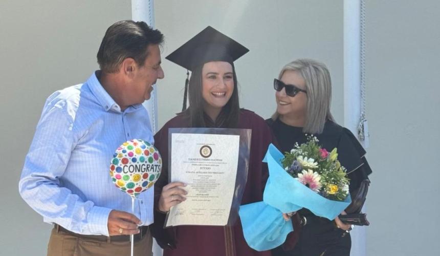 Μία ξεχωριστή και συγκινητική στιγμή έζησαν η Μαρία Δερεδάκη και η οικογένειά της, καθώς η νεαρή Ρεθεμνιώτισσα ολοκλήρωσε τις σπουδές της και πήρε το πτυχίο της από το Τμήμα Θεατρικών Σπουδών του Πανεπιστημίου Πατρών.