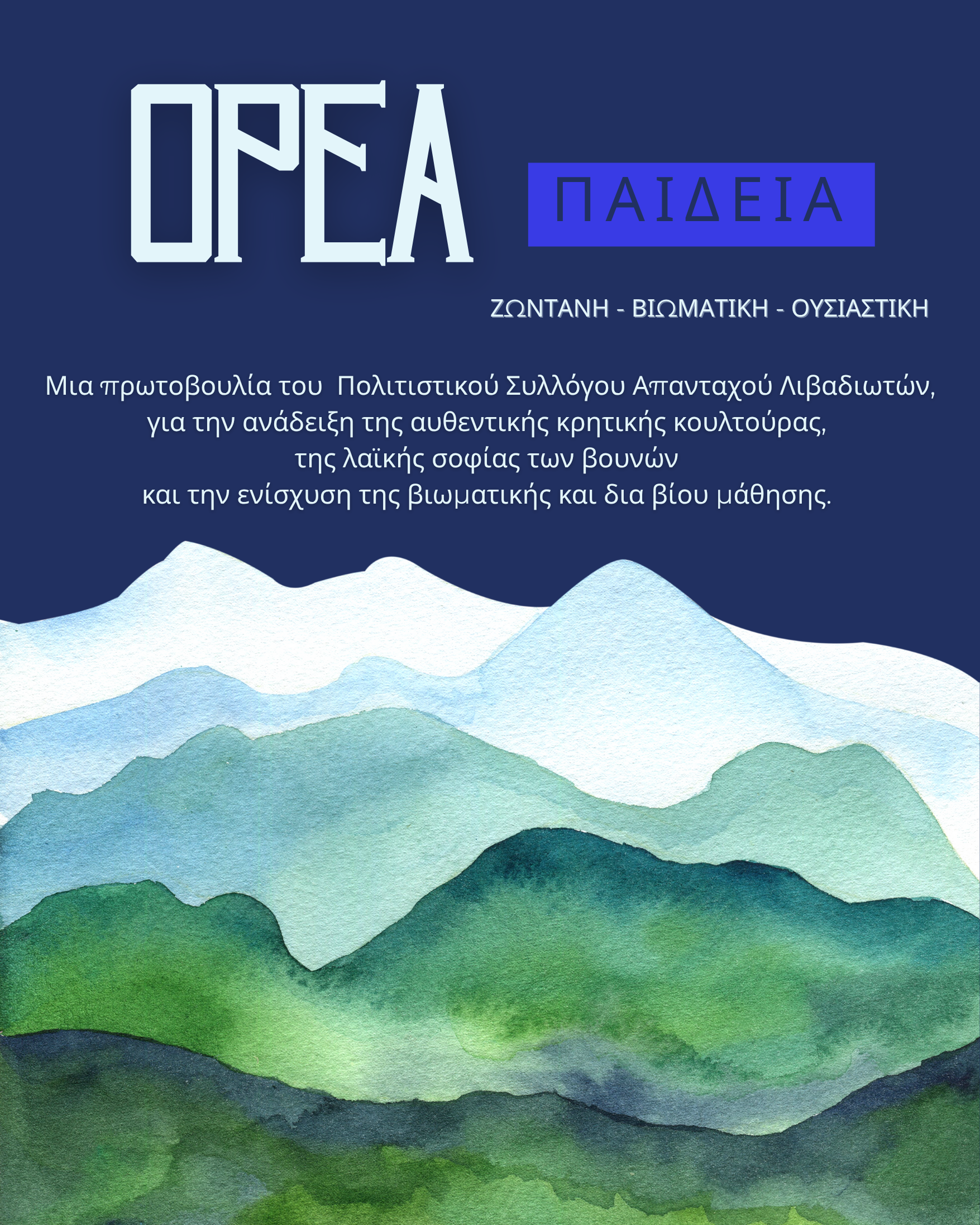 Ο Πολιτιστικός Σύλλογος Απανταχού Λιβαδιωτών, ξεκινά το πρόγραμμα «ΟΡΕΑ ΠΑΙΔΕΙΑ», μια νέα πρωτοβουλία, για την ανάδειξη της αυθεντικής κρητικής κουλτούρας, της λαϊκής σοφίας των βουνών και την ενίσχυση της βιωματικής και δια βίου μάθησης.