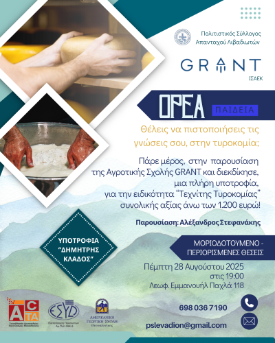 Στο πλαίσιο του προγράμματος, την Πέμπτη 28 Αυγούστου 2025, στις 19:00, θα πραγματοποιηθεί εκδήλωση στις εγκαταστάσεις της ΙΣΑΕΚ GRANT, Λεωφόρος Εμμανουήλ Παχλά 118, στο Ρέθυμνο Κρήτης, οπού θα παρουσιαστεί το ταχύρρυθμο πρόγραμμα τυροκομίας, από τον Αλέξανδρο Στεφανάκη, κτηνίατρο και εκπαιδευτή της σχολής και στη συνέχεια θα πραγματοποιηθεί κλήρωση για μία πλήρη υποτροφία, συνολικής αξίας άνω των 1.200€, εις μνήμην του εκλιπόντος ιατρού Δημήτρη Κλάδου, με τη στήριξη της οικογένειάς του.