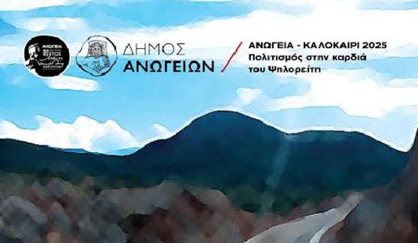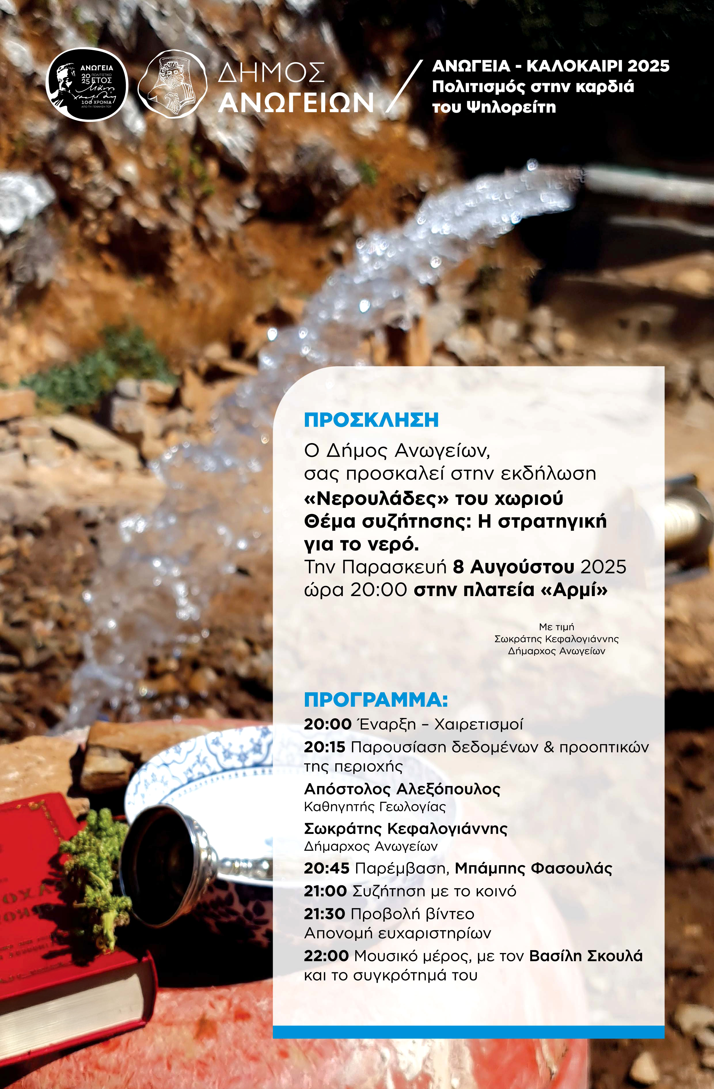 Στο πλαίσιο του πολιτιστικού προγράμματος «ΑΝΩΓΕΙΑ – ΚΑΛΟΚΑΙΡΙ 2025: Πολιτισμός στην καρδιά του Ψηλορείτη», ο Δήμος Ανωγείων οργανώνει ένα διήμερο δημόσιου διαλόγου, με δύο θεματικές βραδιές αφιερωμένες σε ζητήματα κρίσιμα για την αναπτυξιακή προοπτική του τόπου: το νερό και την οδική διασύνδεση των Ανωγείων.