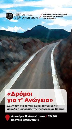 Μια ανοιχτή ενημερωτική συζήτηση για τις αναγκαίες παρεμβάσεις στο οδικό δίκτυο που συνδέει τα Ανώγεια με το Ηράκλειο και το Ρέθυμνο, παρουσία των αρμόδιων υπηρεσιών της Περιφέρειας Κρήτης.