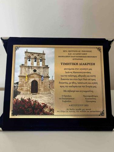 Προ της απολύσεως του Παρακλητικού Κανόνα, ο Εφημέριος της Ενορίας, Αιδεσιμολ. Πρωτοπρεσβύτερος Κωνσταντίνος Τζαγκαράκης, προσφώνησε καταλλήλως τον Σεβασμιώτατο και αναφέρθηκε ιδιαίτερα στον αξιότιμο κ. Ιωάννη Μανουσογιαννάκη, ο οποίος επί δεκαετίες διακονεί εκκλησιαστικώς την Ενορία Κυριάννας, προς τον οποίο προσέφερε, από πλευράς της Ενορίας, τιμητική πλακέτα.