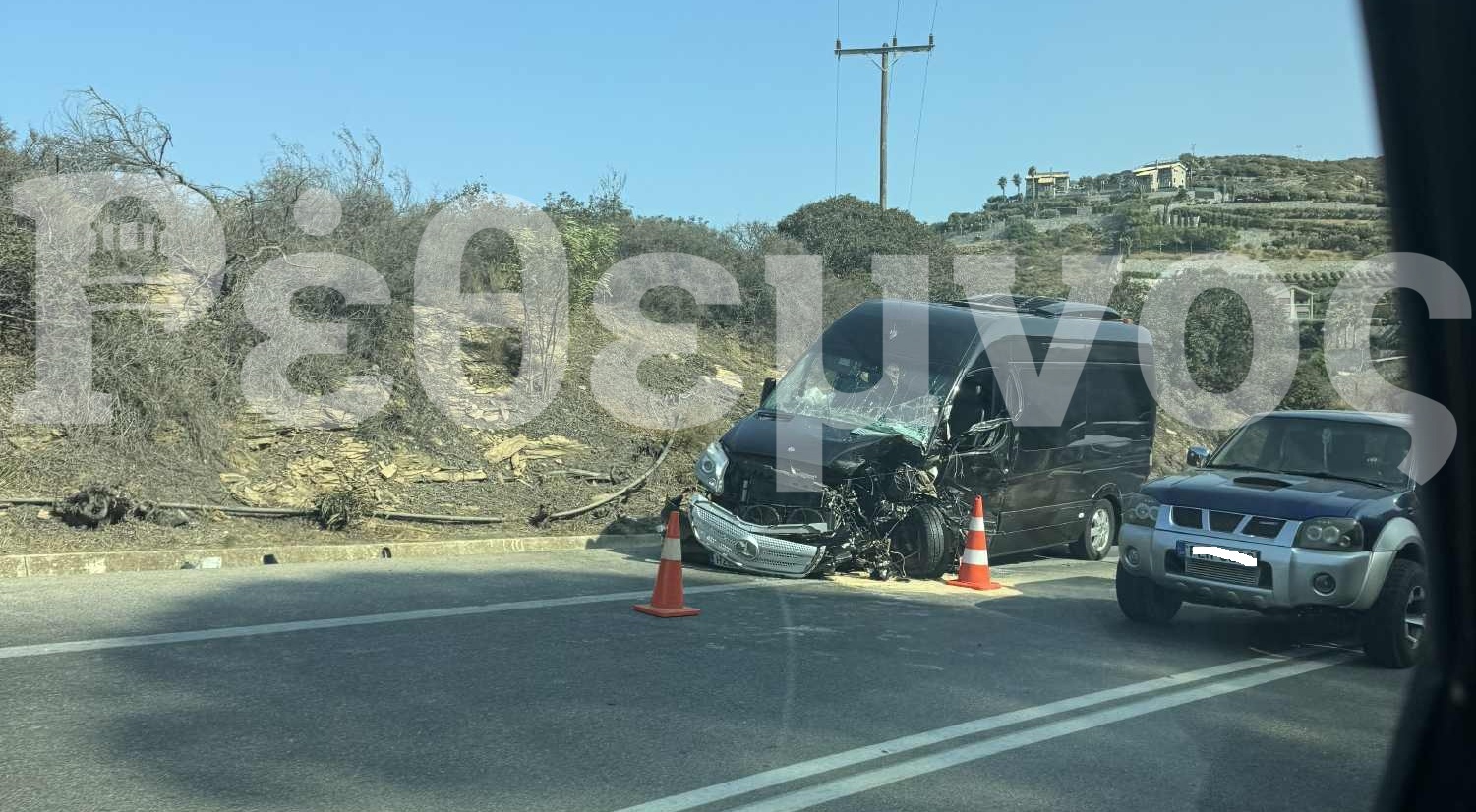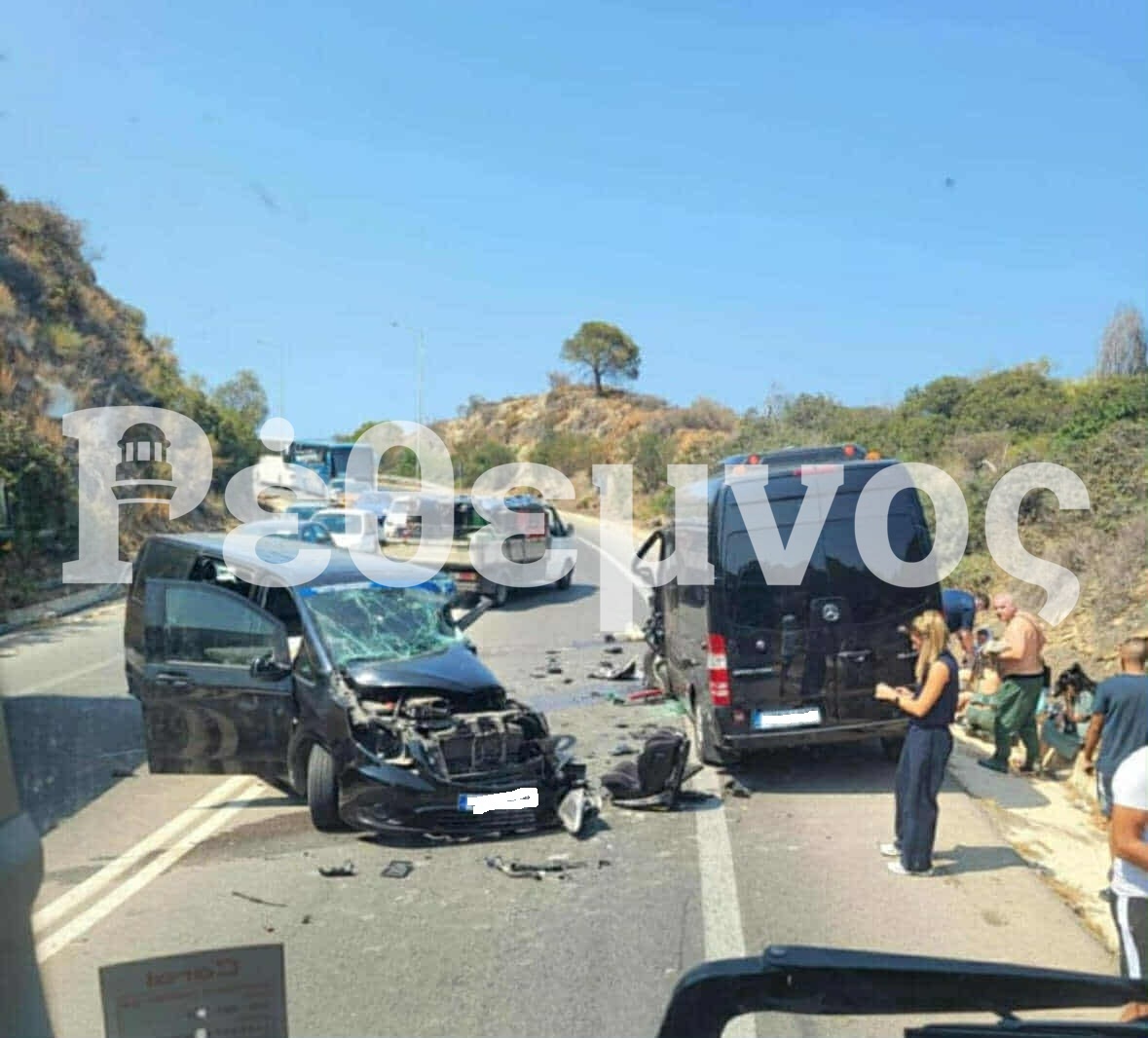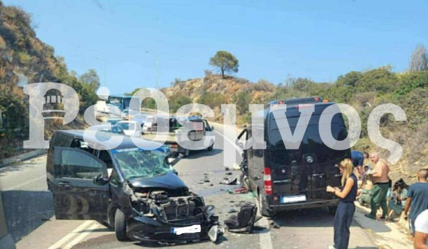 Το ατύχημα σημειώθηκε λίγο μετά τις 15:30. Σύμφωνα με αυτόπτες μάρτυρες που μίλησαν στην ΕΡΤ, το μίνι μπας, το οποίο μετέφερε Πολωνούς τουρίστες από το Καλάμι προς το Αεροδρόμιο Ηρακλείου, πέρασε στο αντίθετο ρεύμα μέσα στη στροφή. Εκεί συγκρούστηκε σφοδρά με άλλο όχημα ίδιου τύπου, που μετέφερε Σλοβένους τουρίστες με κατεύθυνση το Ρέθυμνο. Η οδηγός του δεύτερου οχήματος, στην προσπάθειά της να αποφύγει τη σύγκρουση, έστριψε προς το πρανές, όμως η πρόσκρουση ήταν αναπόφευκτη. Από το τροχαίο τραυματίστηκαν συνολικά οκτώ άτομα, εκ των οποίων ο ένας πιο σοβαρά, ενώ αρκετοί επιβάτες εγκλωβίστηκαν στα οχήματα και χρειάστηκε η επέμβαση της Πυροσβεστικής για τον απεγκλωβισμό τους. Η σύγκρουση προκάλεσε σοβαρά προβλήματα στην κυκλοφορία, με την εθνική οδό να παραμένει για ώρα κλειστή στο σημείο. Οι τραυματίες μεταφέρθηκαν στο Πανεπιστημιακό Νοσοκομείο Ηρακλείου, ενώ η Τροχαία διερευνά τα αίτια του ατυχήματος.