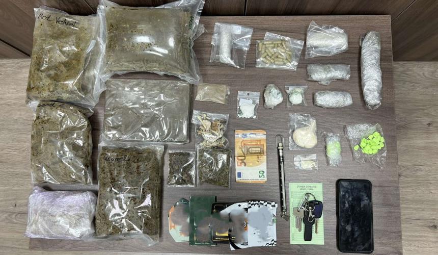 Κατασχέθηκαν μεταξύ άλλων σχεδόν -3 -κιλά κάνναβη (κατεργασμένη και ακατέργαστη), -26,5- κοκαΐνη, -58- γραμμάρια MDMA ,-41- ναρκωτικά δισκία , κεταμίνη ,ηρωίνη