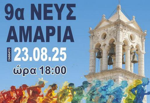 Ο ΔΗΜΟΣ ΑΜΑΡΙΟΥ σε συνεργασία με τον Πολιτιστικό Σύλλογο απανταχού Αμαριανών ο "ΑΓΙΟΣ ΤΙΤΟΣ" και τον Πολιτιστικό Σύλλογο Αμαρίου - Οψιγιά "Η ΣΑΜΙΤΟΣ" διοργανώνουν τους αγώνες Λαϊκούς αγώνες δρόμου "9α ΝΕΥΣΑΜΑΡΙΑ", στις 23 Αυγούστου 2025, ημέρα Σάββατο και ώρα 6:00 μ.μ. στο Νευς Αμάρι, στο πλαίσιο των εκδηλώσεων της γιορτής του Αγίου Τίτου, με ελεύθερη συμμετοχή στις παρακάτω κατηγορίες: