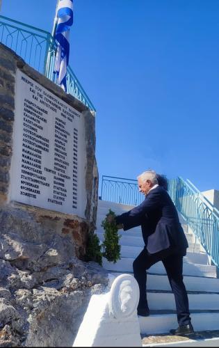 Μετα την επιμνημόσυνη δέηση ο κ. Αποστολάκης κατέθεσε στεφάνι στο Μνημείο Ηρώων και απηύθυνε χαιρετισμό με τον οποίο εξηρε την σημαντική προσφορά των ανθρώπων της περιοχής στον αντιστασιακό αγώνα.