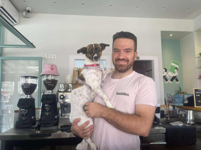 «Ήθελα πάντα να ανοίξω ένα μικρό καφέ όπου θα μπορούσα να έρθω με το σκυλάκι μου χωρίς να ανησυχώ αν θα ενοχληθεί κάποιος πελάτης», λέει. Η αφορμή ήταν η ίδια η γειτονιά του, η οποία είναι γεμάτη με ανθρώπους που βγάζουν καθημερινά βόλτα τα κατοικίδιά τους. Έτσι γεννήθηκε το Buddies, ένας χώρος που υποδέχεται όχι μόνο τους ιδιοκτήτες αλλά και τους τετράποδους φίλους τους.