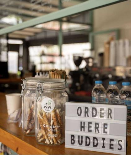 Το Buddies δεν είναι ένα συνηθισμένο καφέ. Εδώ, το νερό για τα διψασμένα ζωάκια είναι πάντα διαθέσιμο, ενώ ο κατάλογος περιλαμβάνει λιχουδιές ειδικά για σκύλους και γάτες. Ο επισκέπτης μπορεί να τις προσφέρει επιτόπου ή να τις πάρει πακέτο στο σπίτι.