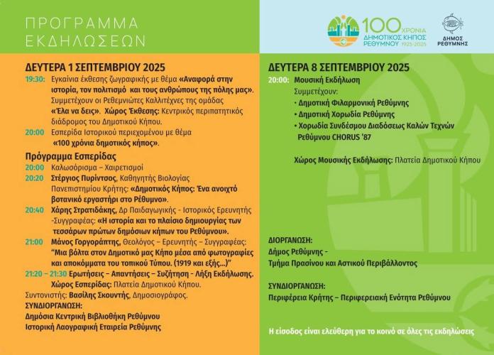 20:00 Εσπερίδα Ιστορικού περιεχομένου με θέμα «100 χρόνια δημοτικός κήπος».
