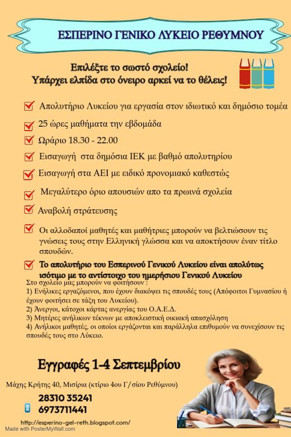 Από 1 Σεπτεμβρίου 2025 έως 4 Σεπτεμβρίου 2025 , η ηλεκτρονική πλατφόρμα e-εγγραφές θα είναι σε λειτουργία προκειμένου να υποβληθούν κατ’ εξαίρεση Ηλεκτρονικές Αιτήσεις εγγραφής για το Εσπερινό Γενικό λύκειο Ρεθύμνου.
