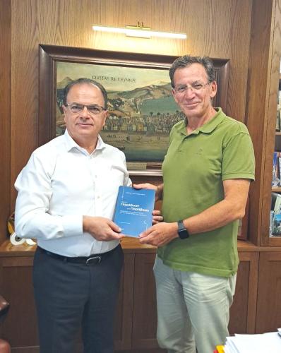 Στο πλαίσιο της επίσκεψης του, ο κ. Παπακωνσταντής δώρισε στον Δήμαρχο τη 2η αναθεωρημένη έκδοση του βιβλίου του «Από την Παράδοση στην Παράβαση», το οποίο, όπως προέκυψε από τη σημερινή τους συνεργασία, θα παρουσιαστεί στο Ρέθυμνο στις 15 Οκτωβρίου 2025, στο «Σπίτι Πολιτισμού».