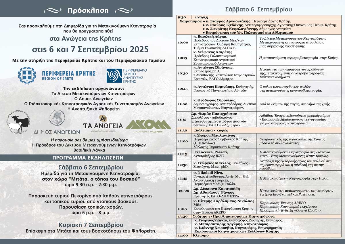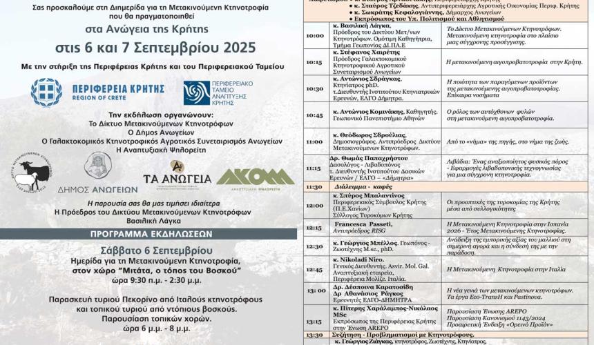 Το Δίκτυο Μετακινούμενων Κτηνοτρόφων με έδρα την Αβερώφιο Σχολή Λάρισας διοργανώνει διημερίδα στα Ανώγεια Ρεθύμνου στις 6 και 7 Σεπτεμβρίου, με στόχο την ανάδειξη της Μετακινούμενης Κτηνοτροφίας, η οποία έχει πρόσφατα εγγραφεί ως Άυλη Πολιτιστική Κληρονομιά της UNESCO.