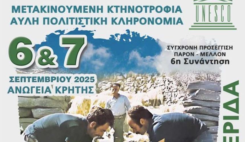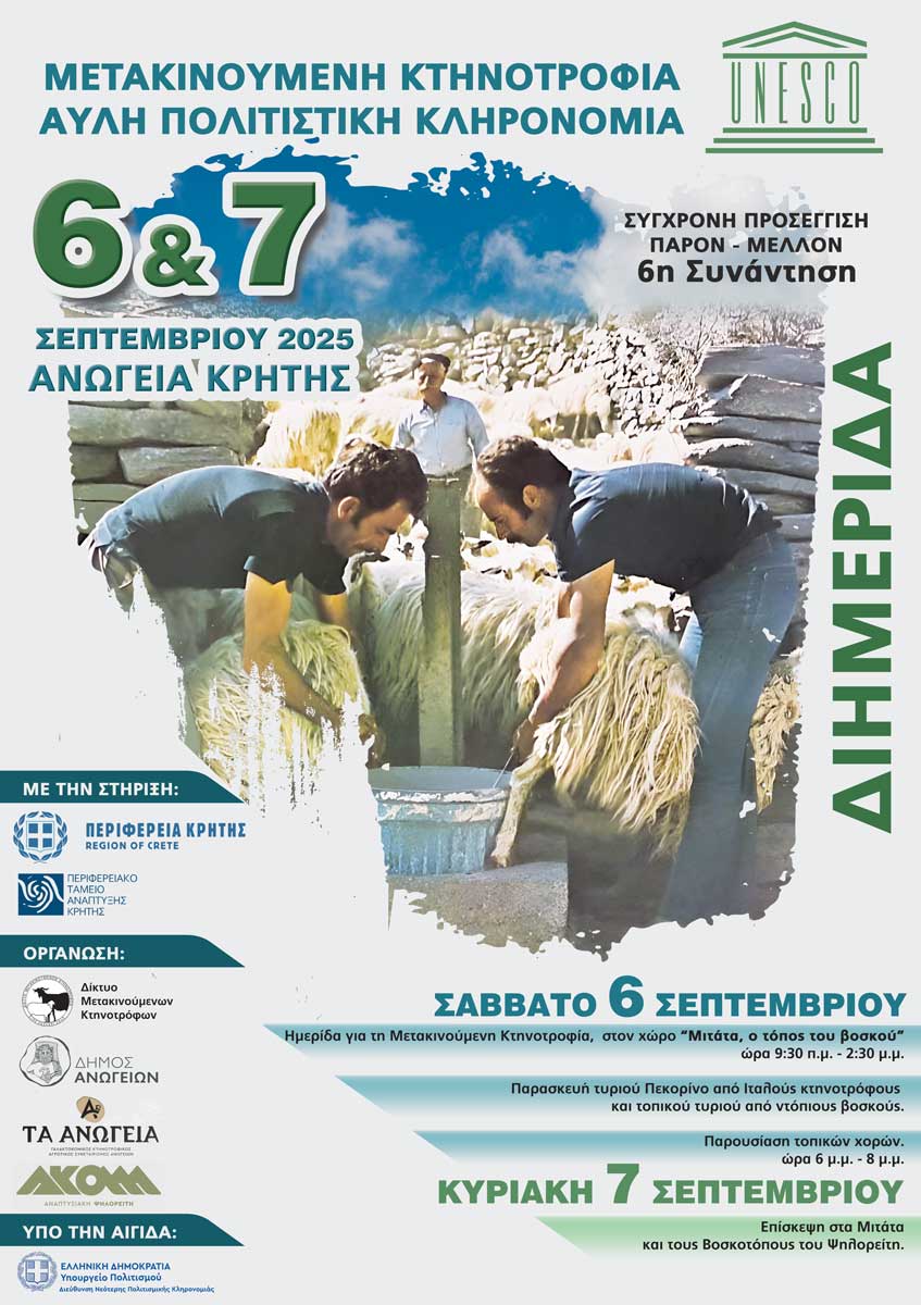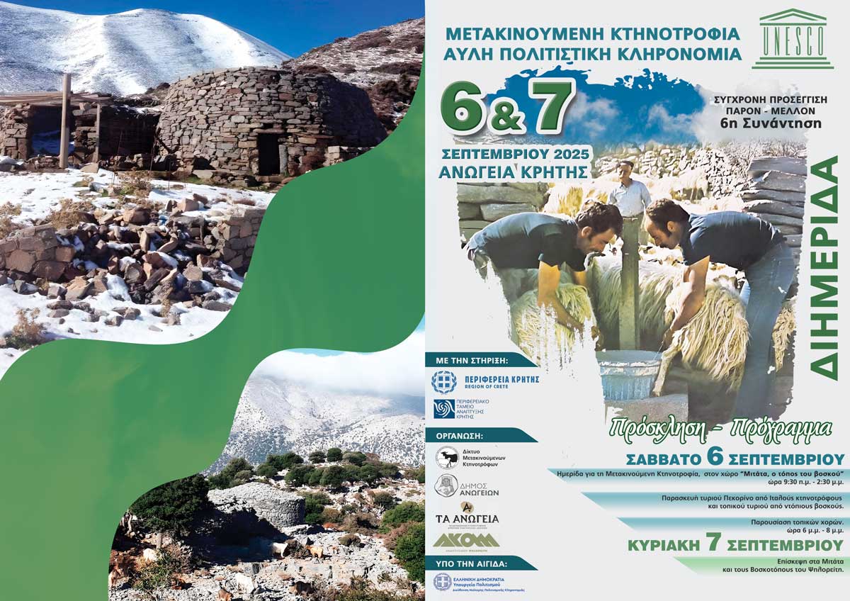 H Περιφέρεια Κρήτης, ο Δήμος Ανωγείων και το Δίκτυο Μετακινούμενων Κτηνοτρόφων σε συνεργασία με το Γαλακτοκομικό Κτηνοτροφικό Αγροτικό Συνεταιρισμό Ανωγείων, τον ΑΚΟΜΜ και το Περιφερειακό Ταμείο Ανάπτυξης Κρήτης, διοργανώνουν Διημερίδα με θέμα: «Μετακινούμενη Κτηνοτροφία - Άυλη Πολιτιστική Κληρονομιά» στις 6 και 7 Σεπτεμβρίου στα Ανώγεια, στο χώρο: «Μιτάτα, ο τόπος του βοσκού», στις 9:30 το πρωί.
