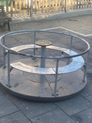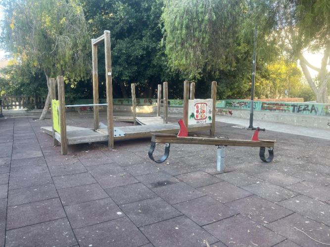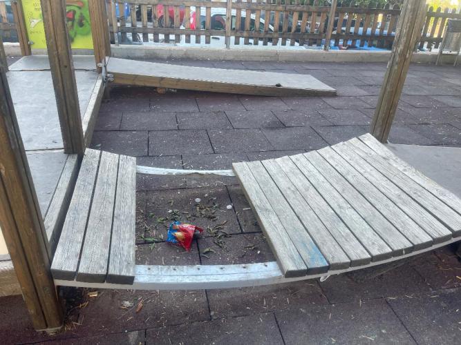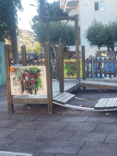 Τα παιχνίδια είναι σπασμένα και σκουριασμένα, με αποτέλεσμα να εγκυμονούν σοβαρούς κινδύνους για τραυματισμούς των παιδιών που ζουν στη γειτονιά. Οι φράκτες, που θα έπρεπε να προστατεύουν τα παιδιά, έχουν γείρει και σε αρκετά σημεία κρέμονται, δίνοντας την εικόνα πλήρους εγκατάλειψης, ενώ η πόρτα της περιμέτρου δεν υπάρχει. Τα σκουπίδια διάσπαρτα και τα πάντα βαμμένα και καλυμμένα με γκράφιτι.
