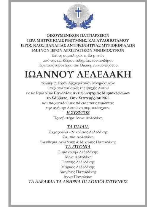 Σε κλίμα συγκίνησης πραγματοποιήθηκε η φετινή εορτή της Παναγίας στα Μυριοκέφαλα, με τον Μητροπολίτη Ρεθύμνου Πρόδρομο να κάνει ιδιαίτερη μνεία στον αείμνηστο παπά Γιάννη Λελεδάκη. «Μπορεί να απουσιάζει σωματικά, αλλά ψυχικά είναι παρών», είπε χαρακτηριστικά, συγκινώντας τους πιστούς που τίμησαν τη μνήμη του. Ο παπά Γιάννης, που άφησε το δικό του στίγμα στην τοπική Εκκλησία, φαίνεται πως συνεχίζει να εμπνέει, αφού ο διάδοχός του, ο παπά Θοδωρής Σηφάκης, κρατά ζωντανό το έργο του με την ίδια θέρμη και αφοσίωση. Μάλιστα, δεν έλειψαν τα σχόλια πως η συνέχεια αυτή δείχνει πως οι αξίες και η πίστη δεν χάνονται, αλλά κληροδοτούνται, βρίσκοντας πάντα ανθρώπους πρόθυμους να τις υπηρετήσουν με συνέπεια και αγάπη.