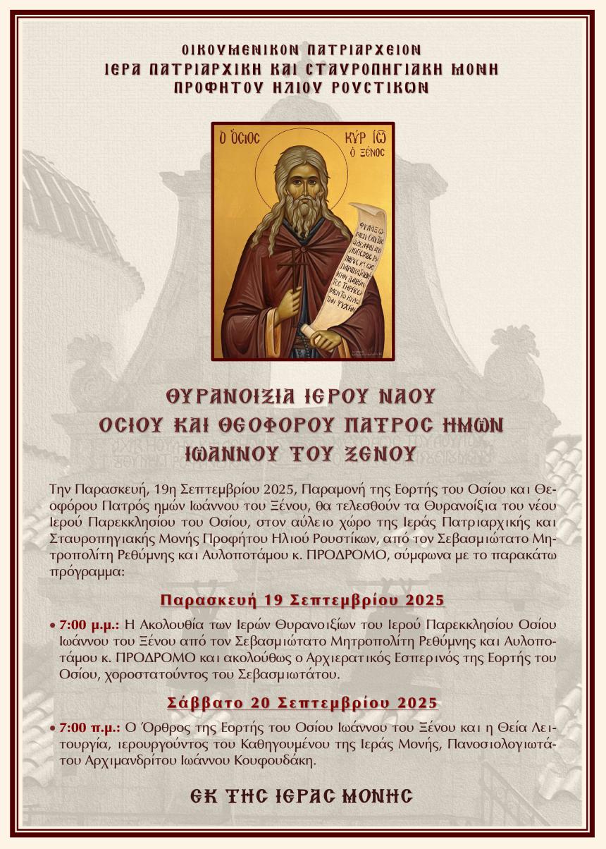 Την Παρασκευή, 19η Σεπτεμβρίου 2025, Παραμονή της Εορτής του Οσίου και Θεοφόρου Πατρός ημών Ιωάννου του Ξένου, θα τελεσθούν τα Θυρανοίξια του νέου Ιερού Παρεκκλησίου του Οσίου, στον αύλειο χώρο της Ιεράς Πατριαρχικής και Σταυροπηγιακής Μονής Προφήτου Ηλιού Ρουστίκων, από τον Σεβασμιώτατο Μητροπολίτη Ρεθύμνης και Αυλοποτάμου κ. ΠΡΟΔΡΟΜΟ, σύμφωνα με το παρακάτω πρόγραμμα: