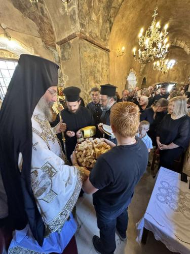Προ της απολύσεως της Θείας Λειτουργίας, ο Σεβασμιώτατος αναφέρθηκε με σεβασμό και τιμή στο πρόσωπο του μακαριστού Πρωθιερέως Ιωάννου Λελεδάκη, επισημαίνοντας ότι «δεν θα μπορούσε και αυτό το μνημόσυνο του π. Ιωάννου, παρά να τελείται μέσα στη χαρά και την ευφροσύνη των ημερών της Εορτής της Παναγίας των Μυριοκεφάλων», καθώς ολόκληρη η ζωή του π. Ιωάννου ταυτίστηκε με την Αντιφωνήτρια των Μυριοκεφάλων.
