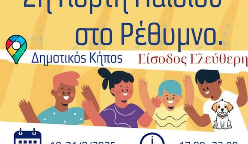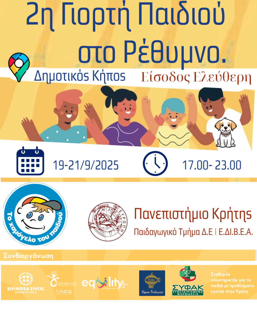 «Το Χαμόγελο του Παιδιού» σε συνεργασία με το Παιδαγωγικό Τμήμα Δ.Ε | Ε.ΔΙ.Β.Ε.Α του Πανεπιστημίου Κρήτης, σας προσκαλούν στη 2η Γιορτή Παιδιού: Παρασκευή 19 Σεπτεμβρίου έως και την Κυριακή 21 Σεπτεμβρίου στον Δημοτικό Κήπο Ρεθύμνου και ώρες από 17.00 έως 23.00.