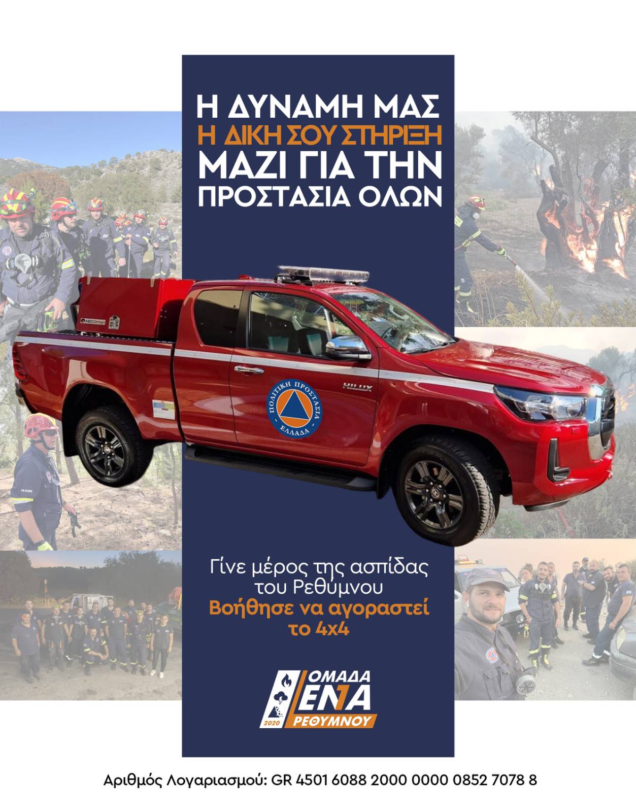 Η Ομάδα Πολιτικής Προστασίας Ένα Ρεθύμνου απευθύνει κάλεσμα προς όλους τους συμπολίτες και φίλους της περιοχής για στήριξη σε μια σημαντική προσπάθεια. Στόχος της ομάδας είναι η απόκτηση ενός οχήματος 4x4, που θα επιτρέψει την ταχύτερη και πιο αποτελεσματική ανταπόκριση σε περιστατικά έκτακτης ανάγκης.