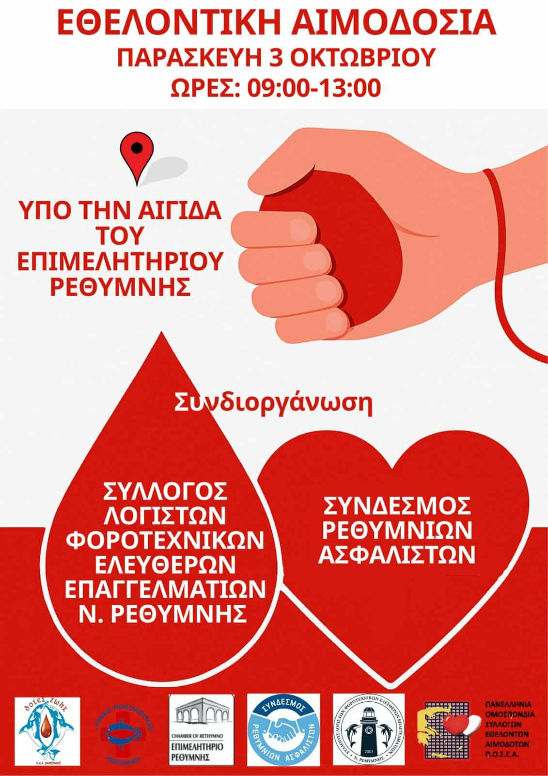 Μια σημαντική πρωτοβουλία εθελοντικής αιμοδοσίας των Ασφαλιστών & Λογιστών του Ν. Ρεθύμνου θα πραγματοποιηθεί την Παρασκευή 3 Οκτωβρίου στο Επιμελητήριο Ρεθύμνης, Εμ. Πορτάλιου 23 1ος Όροφος και Ώρες: 09.00-13.00.