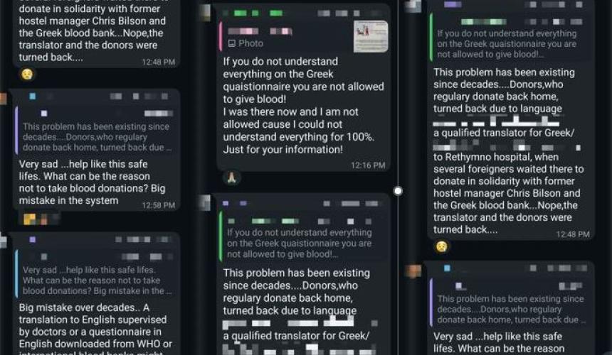 Στον Πλακιά Ρεθύμνου ζουν μόνιμα αρκετοί αλλοδαποί, κυρίως Γερμανοί και Άγγλοι, που επιθυμούν να συνεισφέρουν στην τοπική κοινωνία με αιμοδοσία. Ωστόσο, αντιμετωπίζουν ένα σοβαρό εμπόδιο. Το ερωτηματολόγιο για δωρεά αίματος είναι διαθέσιμο μόνο στα ελληνικά. Όσοι δεν γνωρίζουν τη γλώσσα απορρίπτονται, ακόμη κι όταν προσέρχονται με πιστοποιημένο μεταφραστή. Το αποτέλεσμα είναι ότι πρόθυμοι εθελοντές απομακρύνονται, ενώ η ανάγκη για αίμα στη χώρα παραμένει μεγάλη. Το πρόβλημα αυτό δεν είναι μόνο πρακτικό αλλά και ηθικό, καθώς η γλωσσική φραγή στερεί πολύτιμες μονάδες αίματος από τα νοσοκομεία. Μια απλή λύση θα ήταν η παροχή ερωτηματολογίων σε βασικές ξένες γλώσσες ή η παρουσία διερμηνέα. Έτσι, η αιμοδοσία θα γινόταν πιο προσβάσιμη, εξασφαλίζοντας ότι κανείς πρόθυμος δότης δεν θα απορρίπτεται λόγω γλωσσικών περιορισμών.