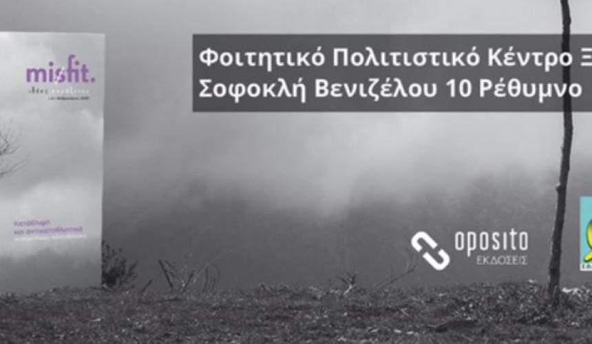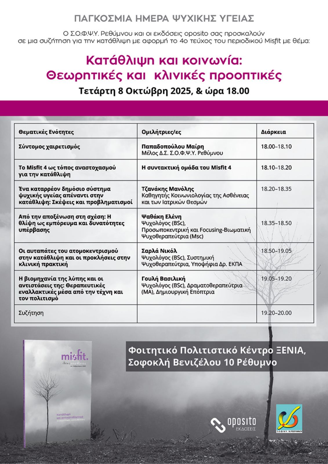 Ο Σύλλογος Οικογενειών και Φίλων για την Ψυχική Υγεία Σ.Ο.Φ.Ψ.Υ. Ρεθύμνου, στο πλαίσιο των εκδηλώσεων για την Παγκόσμια Ημέρα Ψυχικής Υγείας στις 10 του Οκτώβρη και σε συνεργασία με τις εκδόσεις oposito – με αφορμή την έκδοση του 4ου τεύχους του περιοδικού misfit, σας προσκαλούν σε συζήτηση την Τετάρτη 8 Οκτώβρη 2025, στο ΞΕΝΙΑ με θέμα :