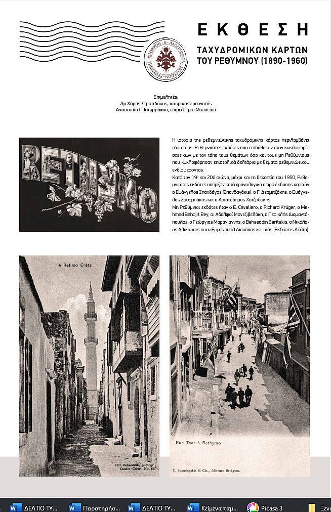 Έκθεση με ταχυδρομικές κάρτες του Ρεθύμνου της περιόδου 1890-1960 διοργανώνει το Ιστορικό και Λαογραφικό Μουσείο Ρεθύμνης. Πρόκειται για 79 πρωτότυπες κάρτες, με θεματολογία την πόλη του Ρεθύμνου σε πανοραμικές της λήψεις, το παλιό Λιμάνι, το Διοικητήριο, τους Στρατώνες, το Δημοτικό Νοσοκομείο, την Προκυμαία καθώς και πρόσωπα, απόψεις και στιγμές της πόλης. Η έκθεση περιλαμβάνει επίσης ταχυδρομικές κάρτες με θέματα από τη ρεθεμνιώτικη επαρχία: τα μοναστήρια της και ειδικότερα το Αρκάδι, με μνημεία, πρόσωπα και ιστορικές στιγμές του, το όρος Ίδη, τον Μυλοπόταμο και ιδιαιτέρως τα Ανώγεια, το Αμάρι κ.ά.