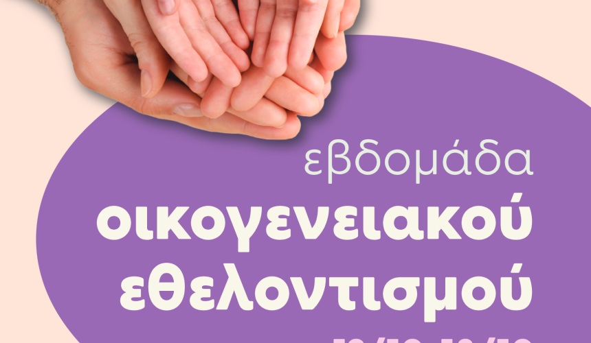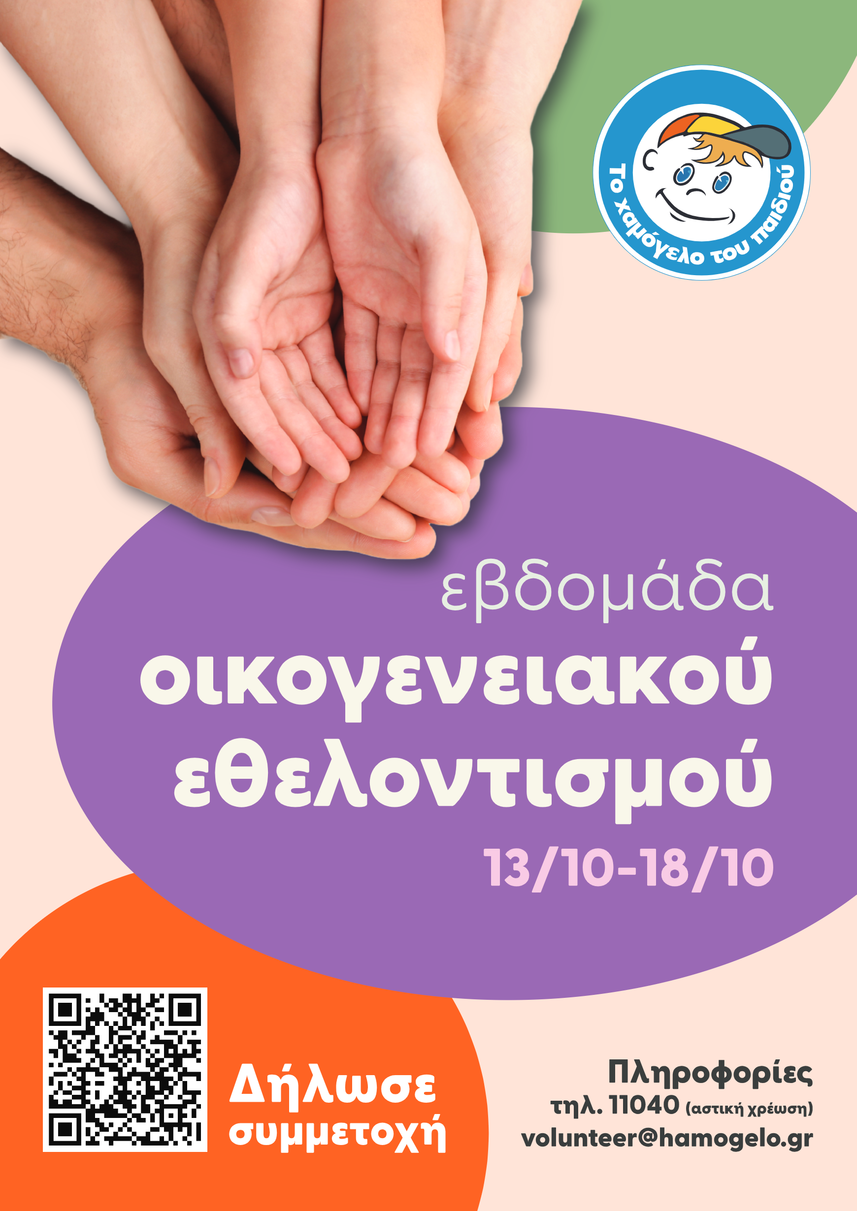 Με μεγάλη χαρά «To Χαμόγελο του Παιδιού», προσκαλεί μικρούς και μεγάλους στην Εβδομάδα Οικογενειακού Εθελοντισμού που θα πραγματοποιηθεί από τη Δευτέρα 13 Οκτωβρίου 2025 έως και το Σάββατο 18 Οκτωβρίου 2025 στα «Κέντρα Υποστήριξης παιδιών, νέων & ευάλωτων οικογενειών», πανελλαδικά (Αττική, Θεσσαλονίκη, Κόρινθος, Κρήτη - Ηράκλειο, Κρήτη - Ρέθυμνο, Κρήτη-Χανιά, Λάρισα, Πάτρα, Πύργος).